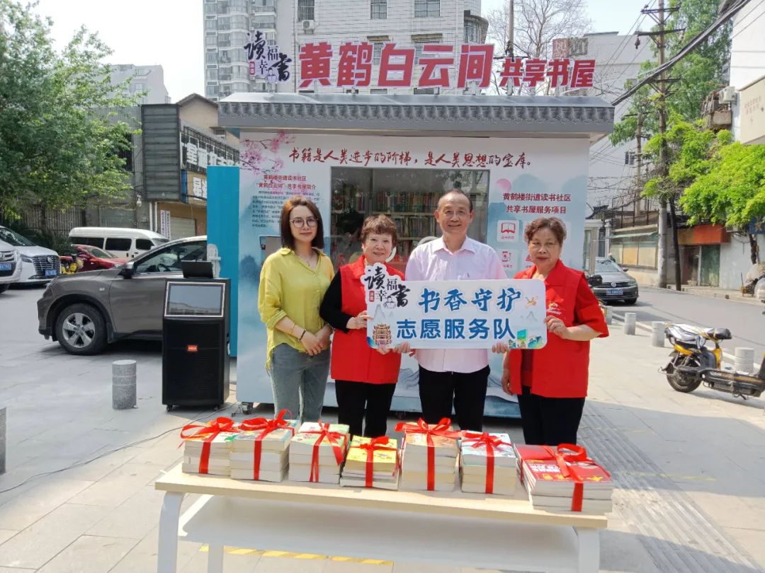 ▲宋述萍(左二)动员辖区居民将闲置图书捐赠到黄鹤白云间共享书屋