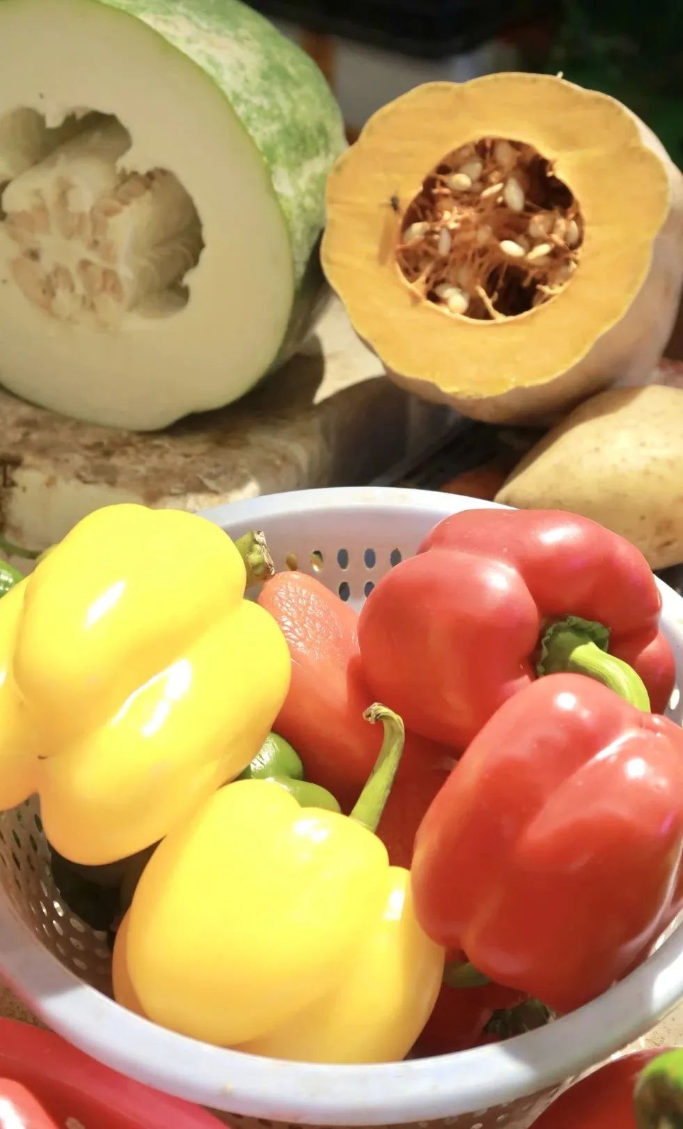 蔬菜区更是不甘示弱,摊贩们摆满了各种颜色鲜艳的蔬菜,仿佛是大自然的调色板。红通通的西红柿、黄澄澄的玉米、青翠欲滴的蔬菜、圆润的南瓜以及鲜红的辣椒,它们散发着令人陶醉的香气,为秋天的餐桌增添了色彩和美味。