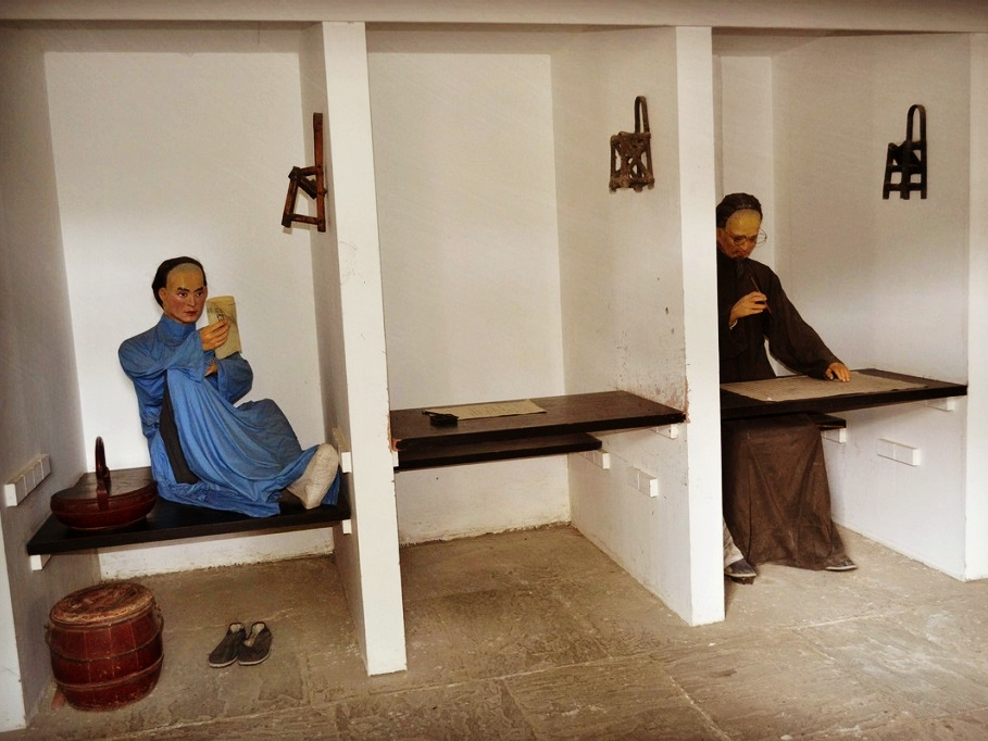 甬道两侧就是考场(又称东文场、西文场)。从南至北排着一排排东西向的号筒(东西向横线所示即是),每个号筒内部又被分割为50-100间左右大小相当的号舍。各号筒按千字文顺序编号,号舍则以号筒的字为头依次编号,如地字号第一间,为“地一”,以此类推。每间号舍宽三尺,深四尺,后墙高约八尺,前檐高约六尺,建筑面积约1.2平米。号舍两边砖墙上离地一尺五寸、二尺五寸处各留一道砖缝或砖托,用于搁置号板。号板由两块木板组成,若都放在下面砖托里,刚好铺满号舍,可当考生夜晚休息的床用,若将外侧号板挪至上一层砖托,则刚好组成一对桌椅,可供考生考试答题用。考生一人一间号舍进行考试。号舍三面密闭,南面完全敞开,紧对前一排号舍的后墙。每排号筒前有巷道,宽约1米余。每排号筒的最后一间号舍设为公共厕所。考场内还设大水缸,雇有挑夫专门挑水,以备考生取用。