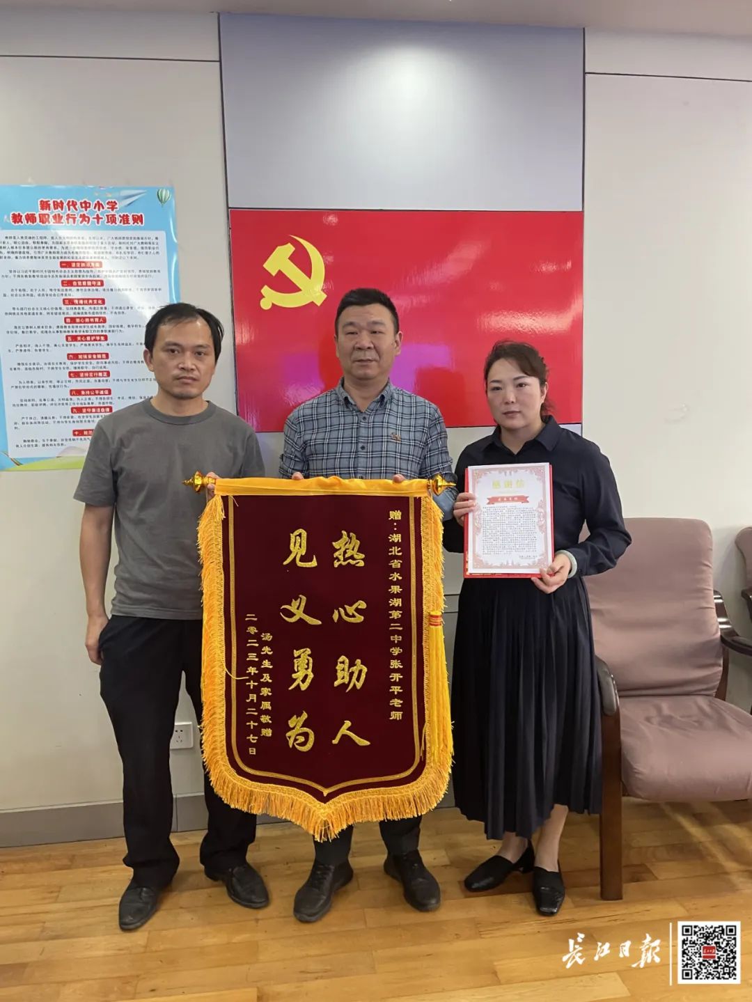 ▲梁女士和丈夫给张开平(中)送来锦旗表示感谢