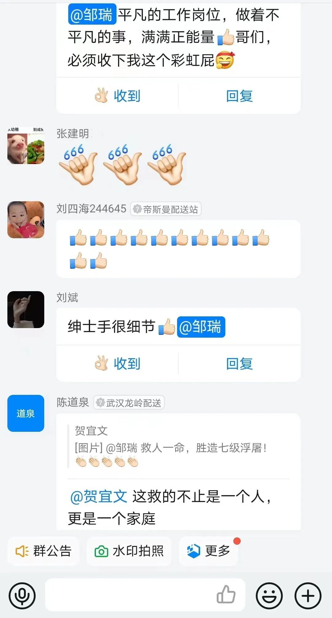▲工作群中同事们为邹瑞点赞