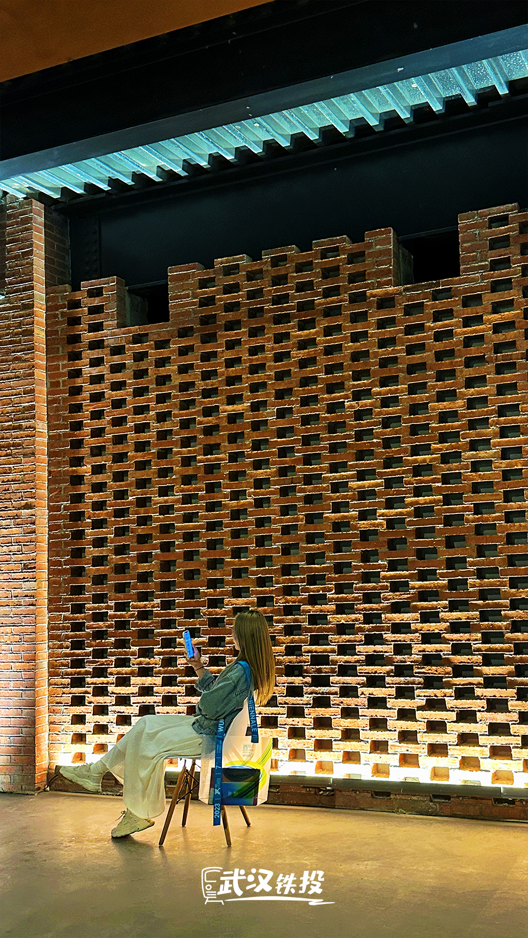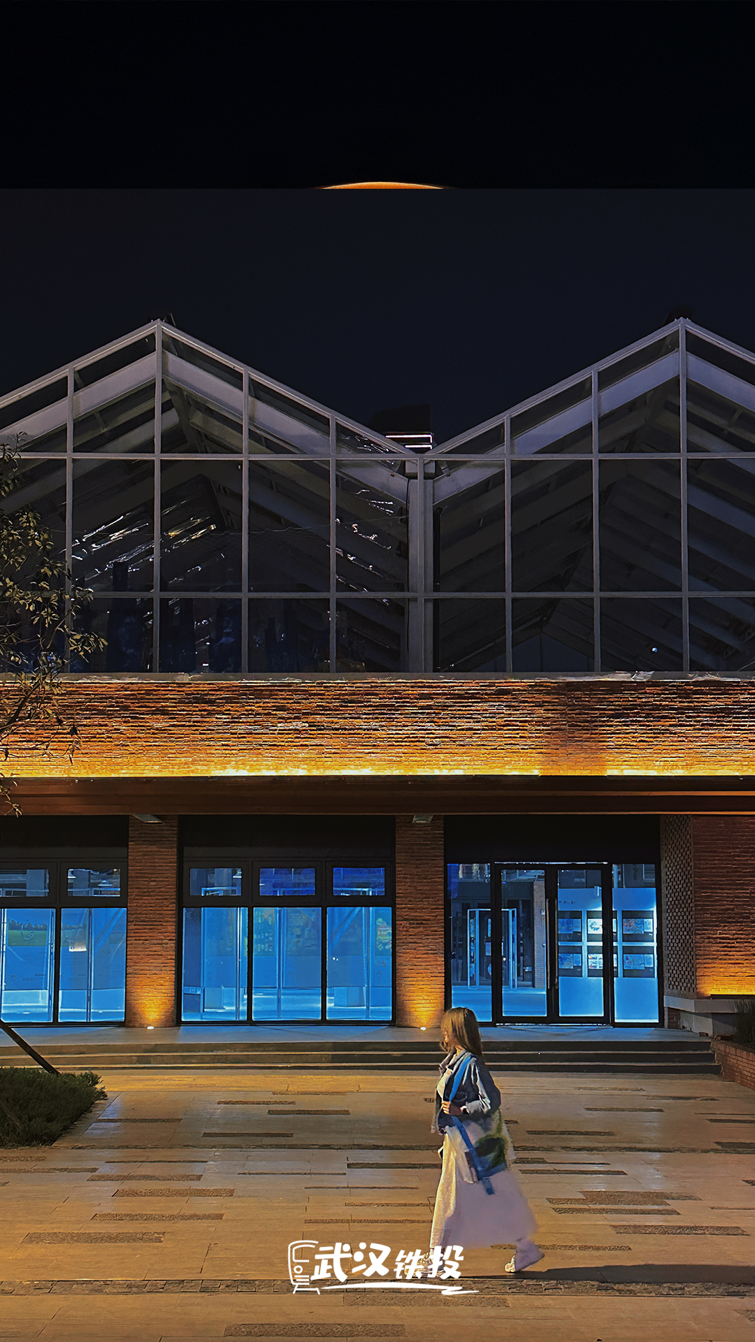 红色复古的展馆外墙在夜晚泛起柔光,以墙为底色,拍出的照片文艺复古。