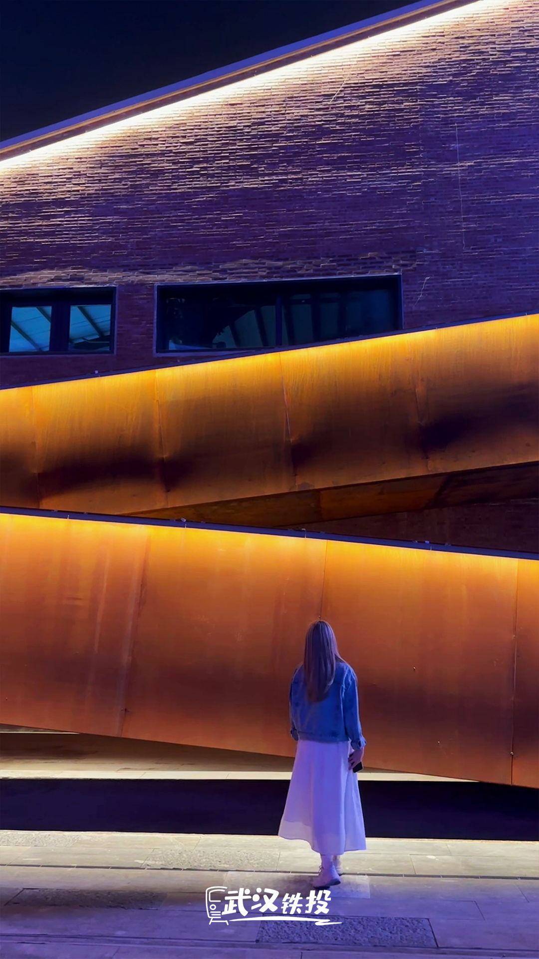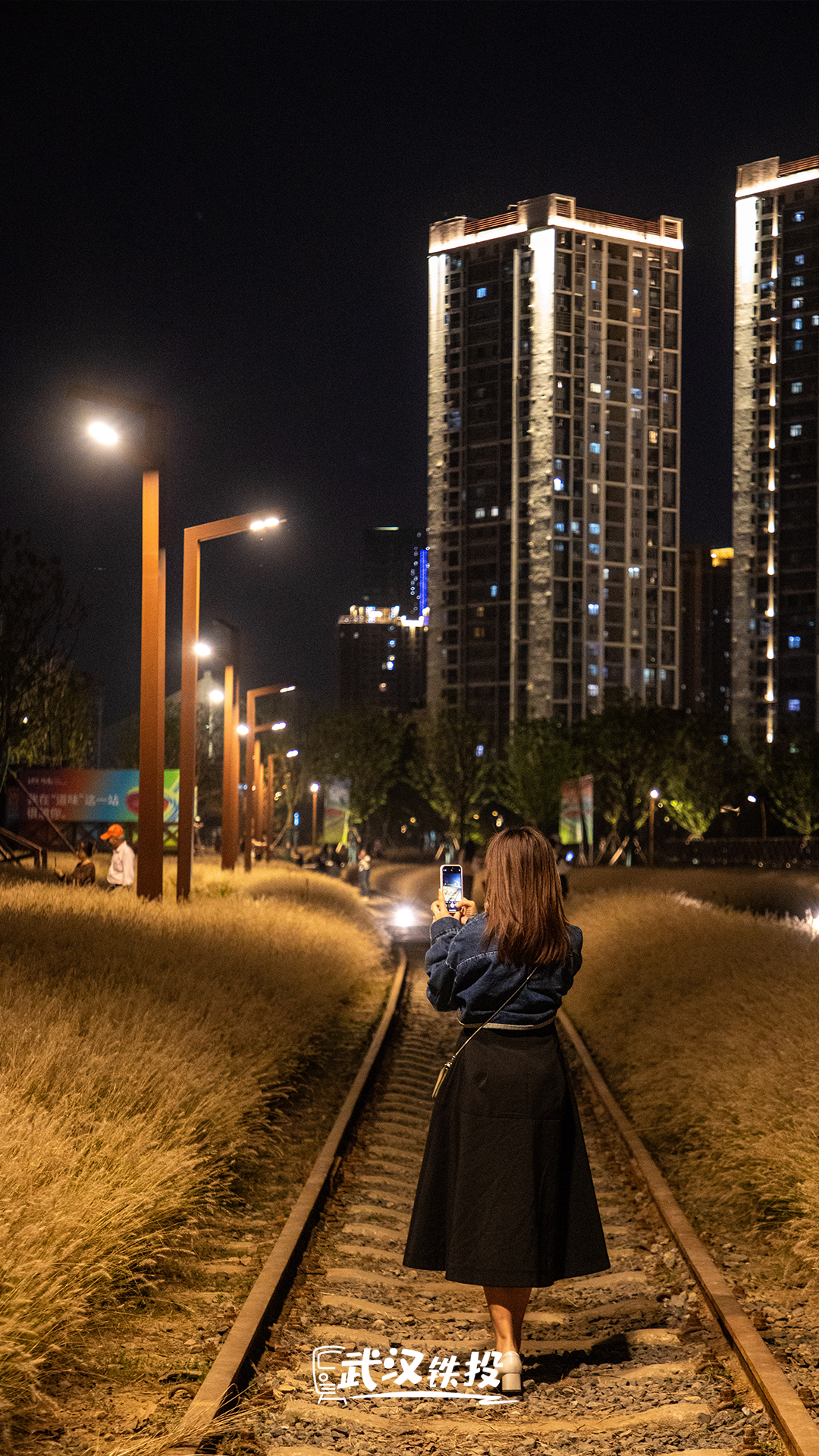 夜色下漫步四美塘,走上发光阶梯,就可以看到发光铁路桥混凝土T梁后的江城夜景,城市与工业的交织,神秘又有趣。