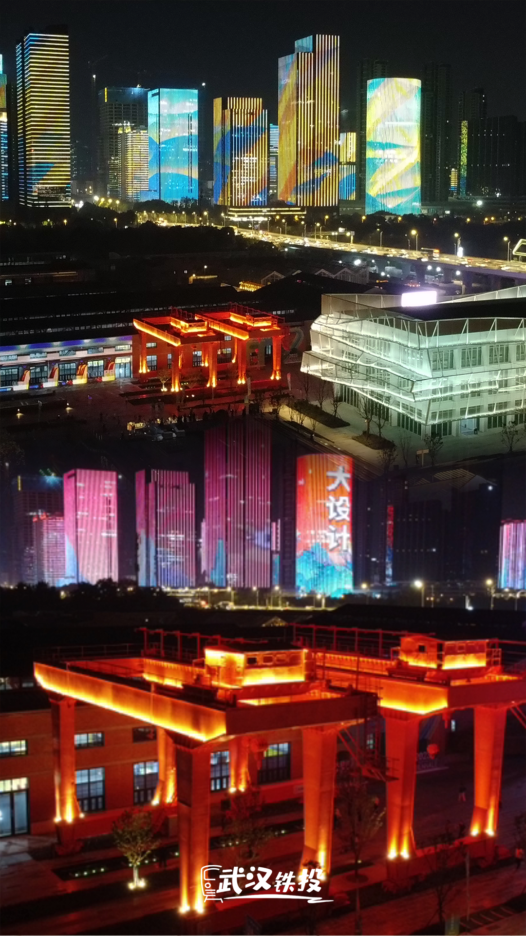 园区建筑与江城夜景相互辉映,夜色里,灯光秀如梦似幻。
