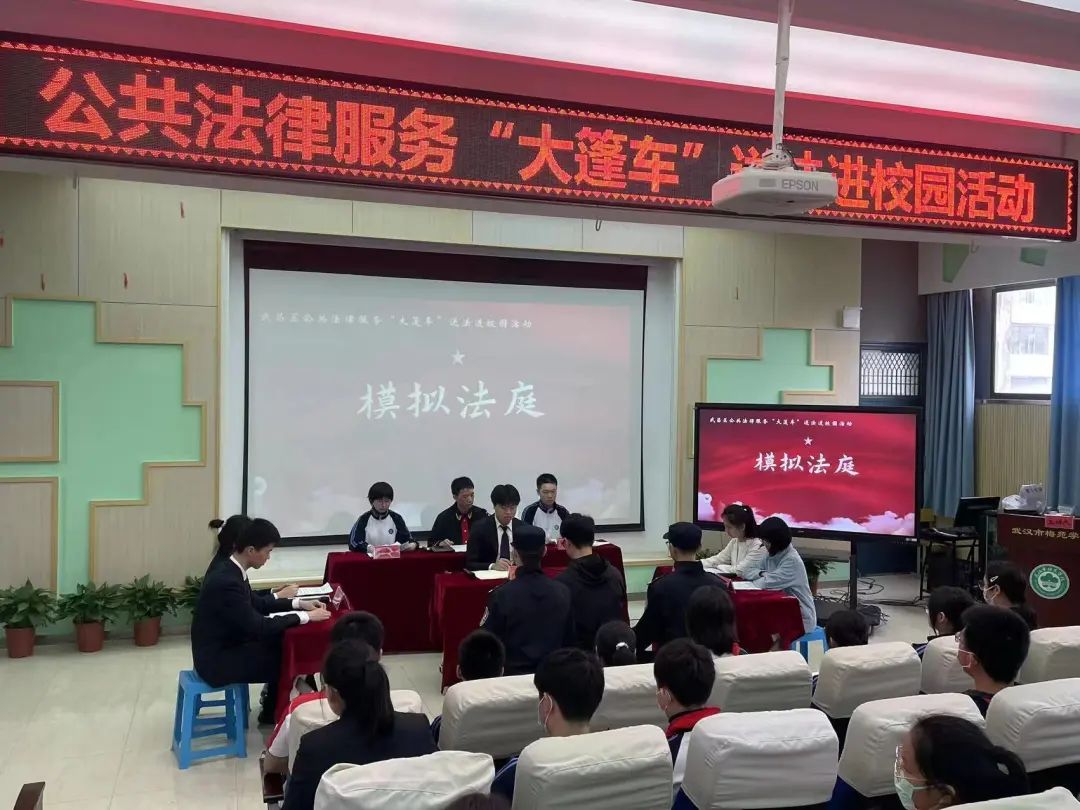 2023年4月14日,武汉梅苑中学的11名学生穿上制服,化身审判长、书记员、公诉人、辩护人、被告人等角色,以一起未成年人持刀抢劫案件为蓝本,感受案件审判过程中法律的公正、严肃与神圣。当天,武昌区公共法律服务“大篷车”走进校园,联合教育、法院、检察院等部门带来精彩的模拟法庭和法律咨询活动,将学法守法的种子种在青少年的心中。