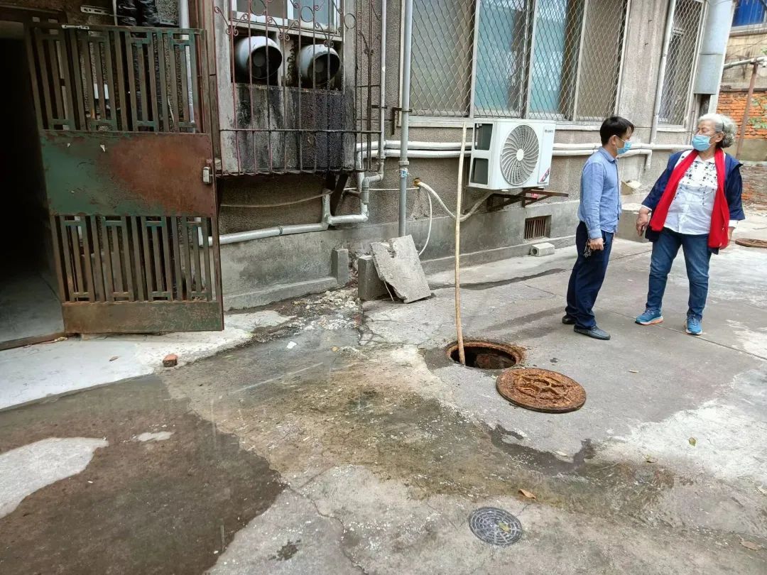 ▲ 洪山一巷省建行宿舍居民代表在管道改造施工现场跟进施工进程