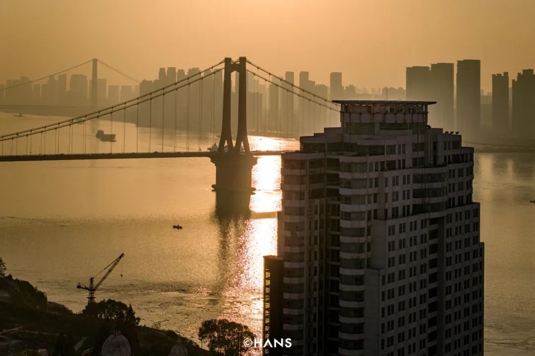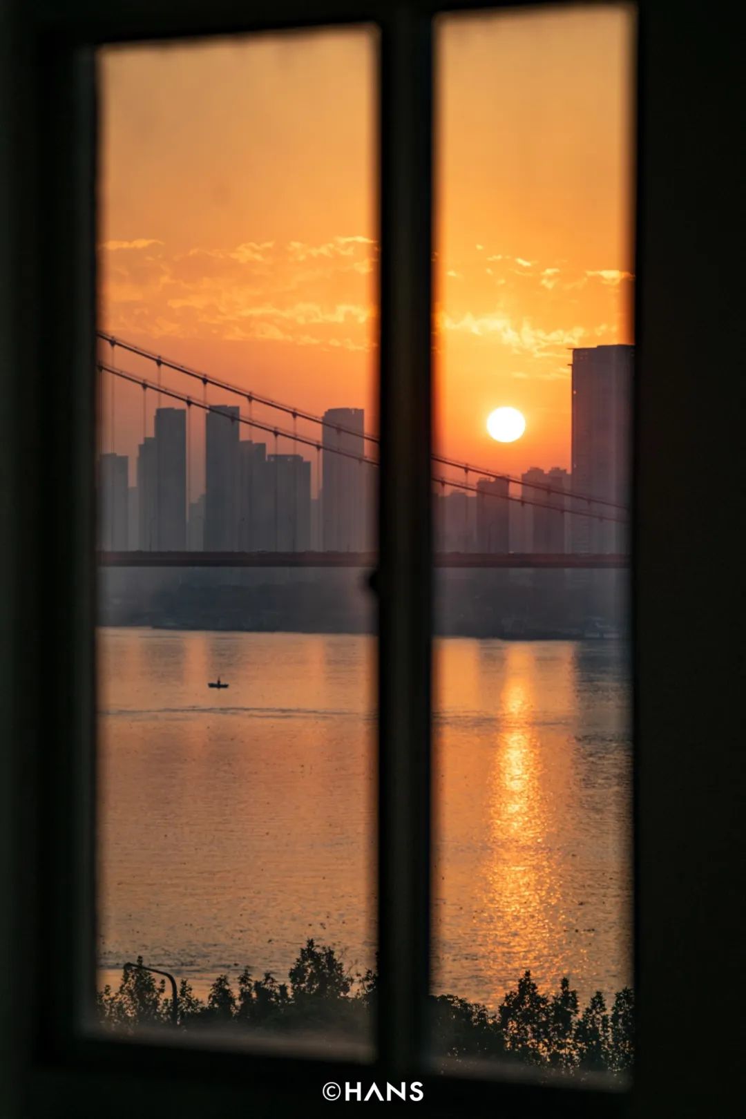 一面对着大桥,一面对着鹦鹉洲,白天看日升日落橘子海,晚上看武汉小“金门大桥”红光满面,随手对着窗户一拍,就是摄影师傅们梦寐以求才能寻得的top级机位,武音人的日常,浪漫得你不敢想。