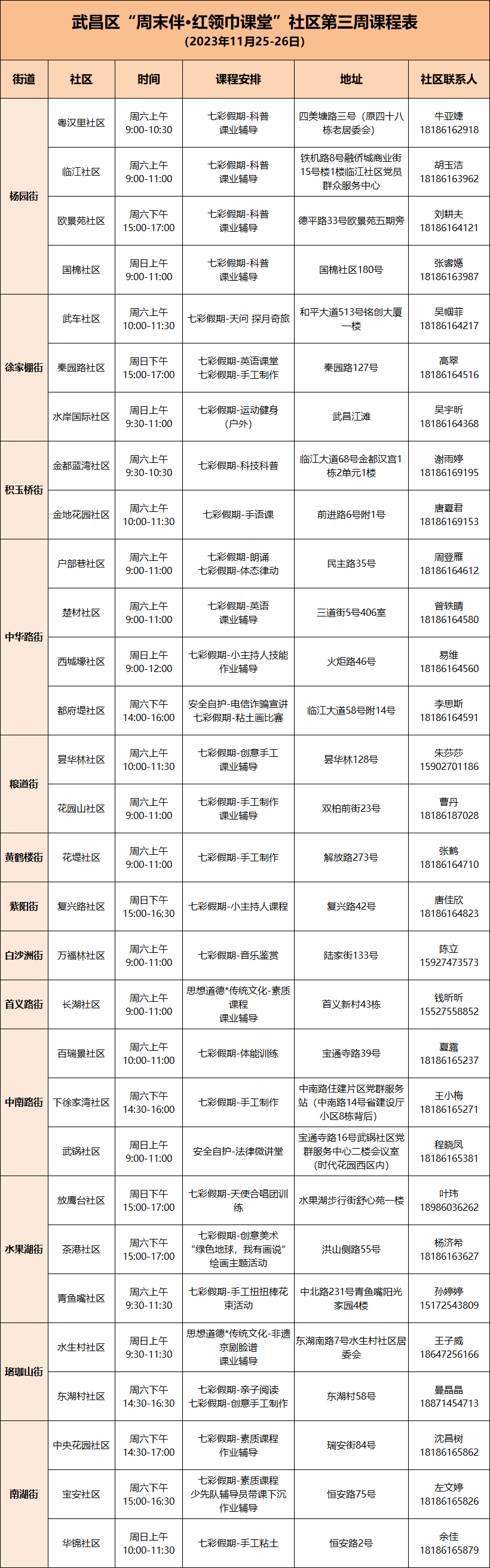 截至目前,“红领巾课堂”已经开展两期,服务青少年1200余人次,受到青少年的广泛喜爱和青年家长的高度认可。本周末第三期即将开始,课程安排如下: