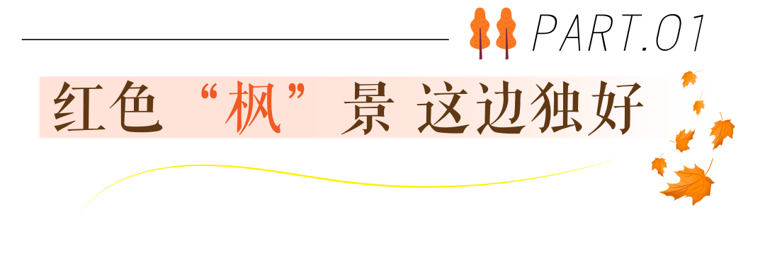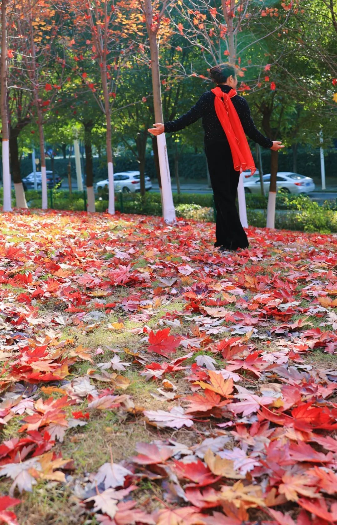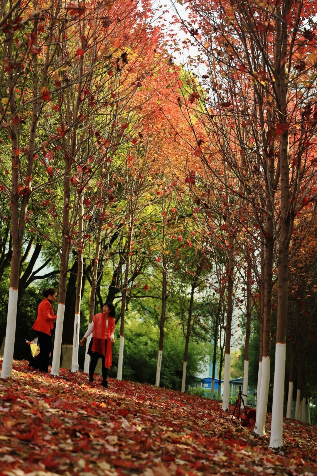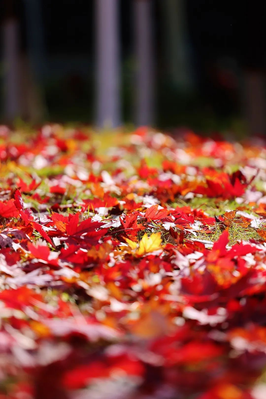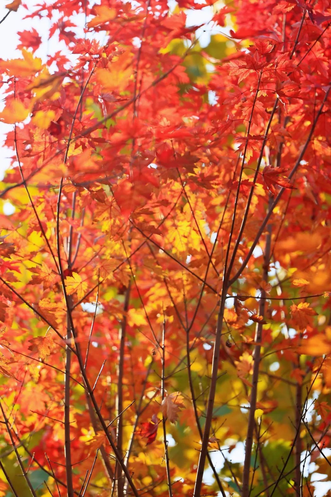 远方的黄绿植被与色彩斑澜的枫叶相映成趣。