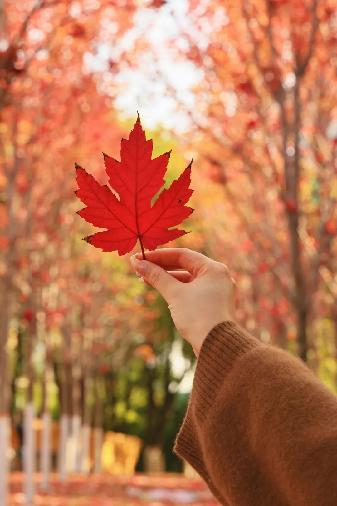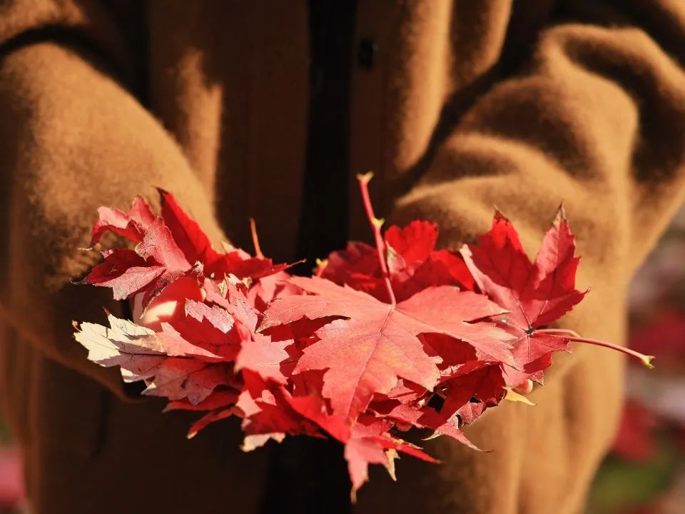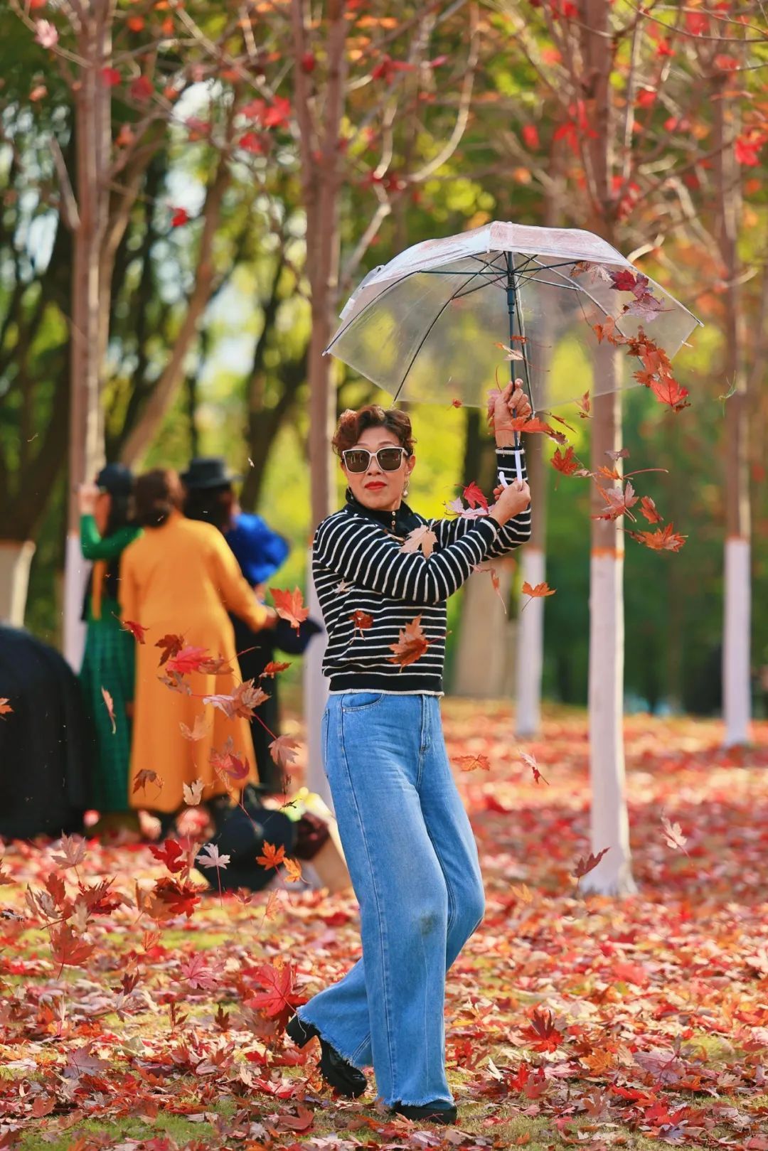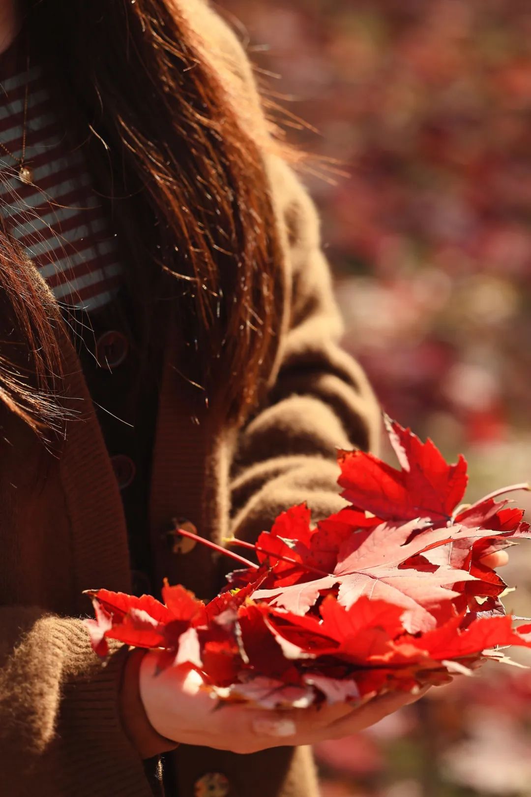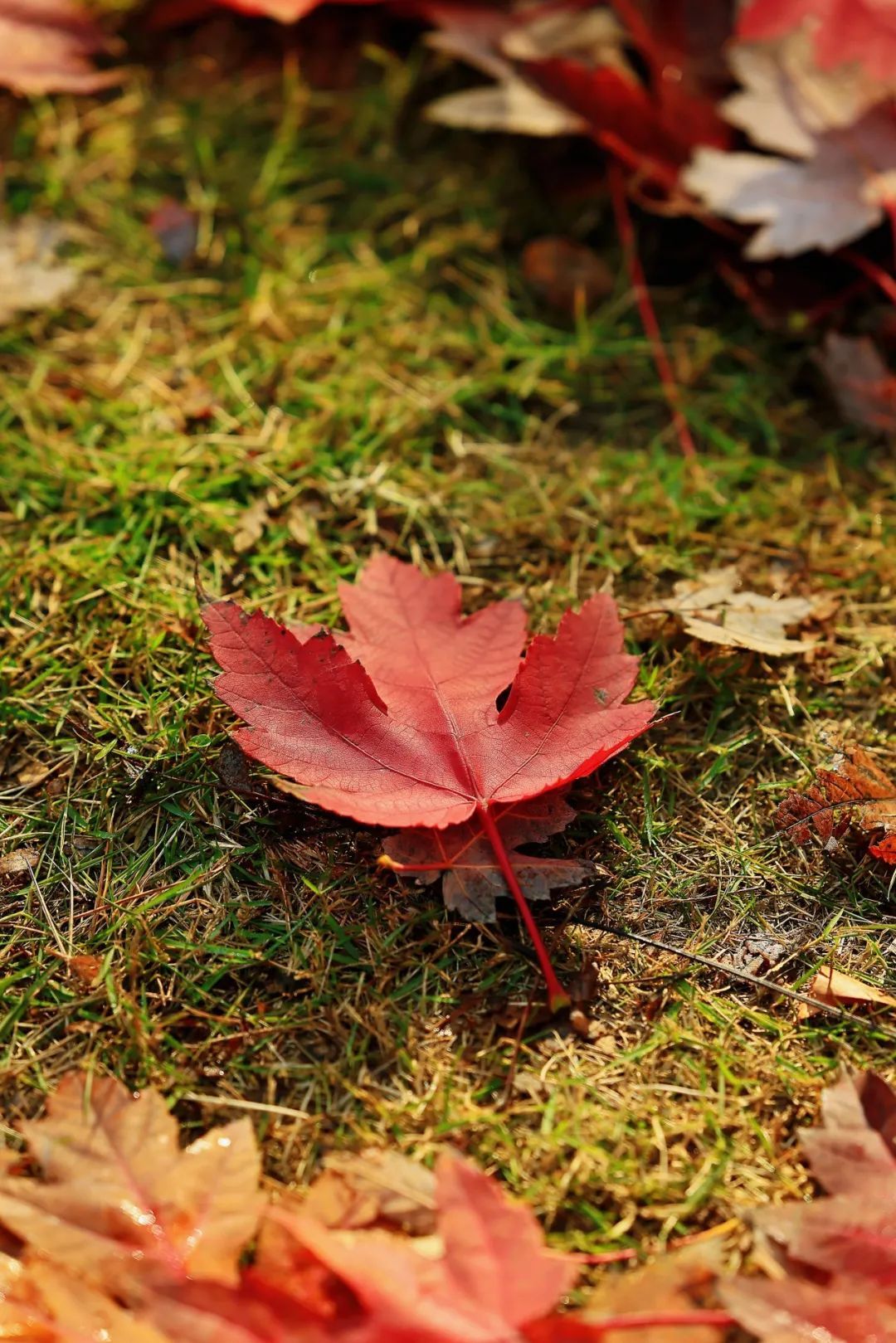 远方的黄绿植被与色彩斑澜的枫叶相映成趣。