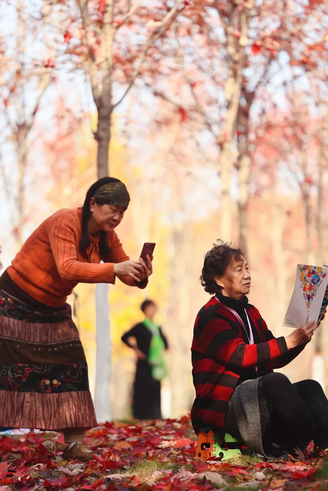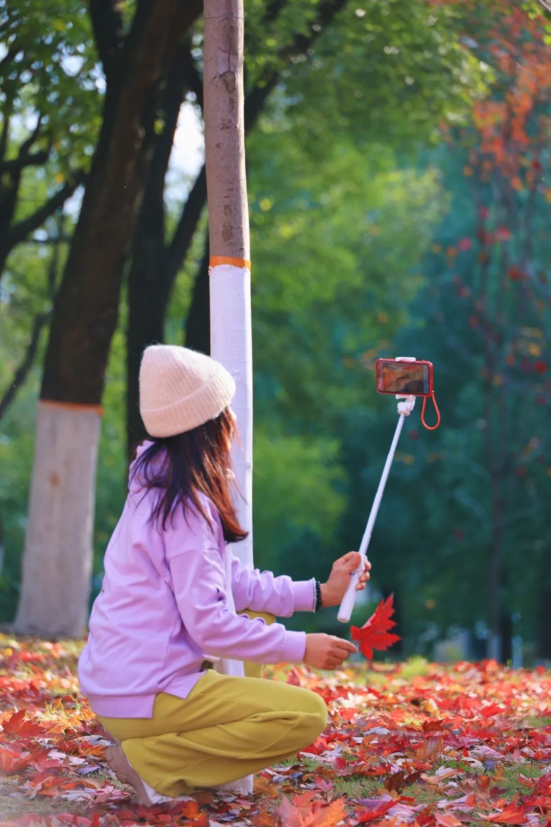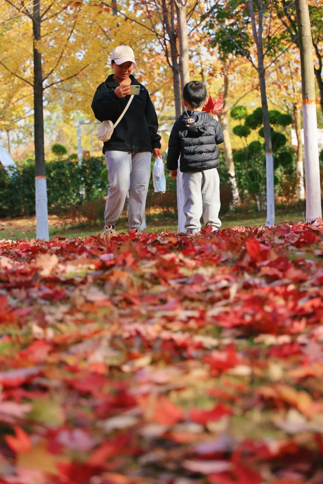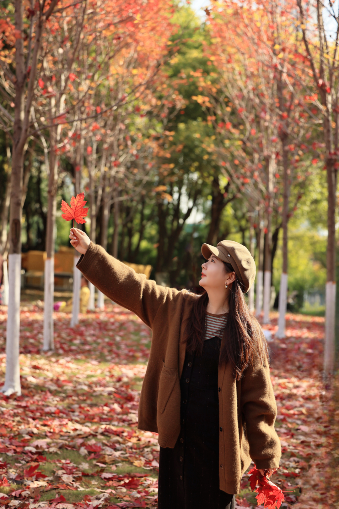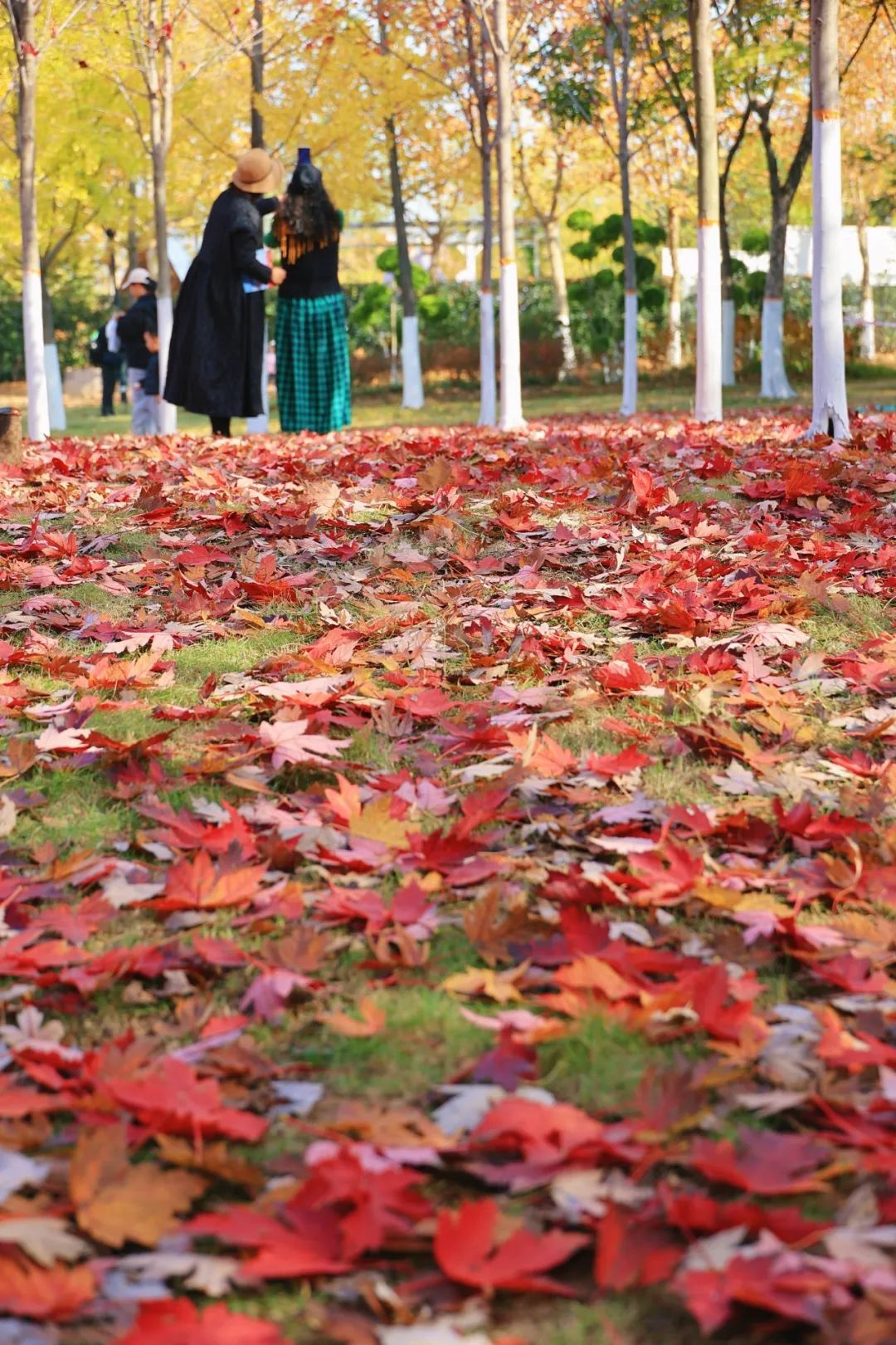 远方的黄绿植被与色彩斑澜的枫叶相映成趣。