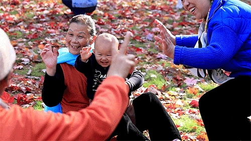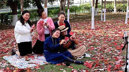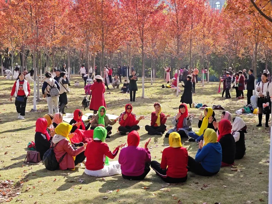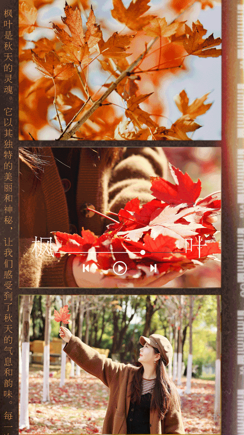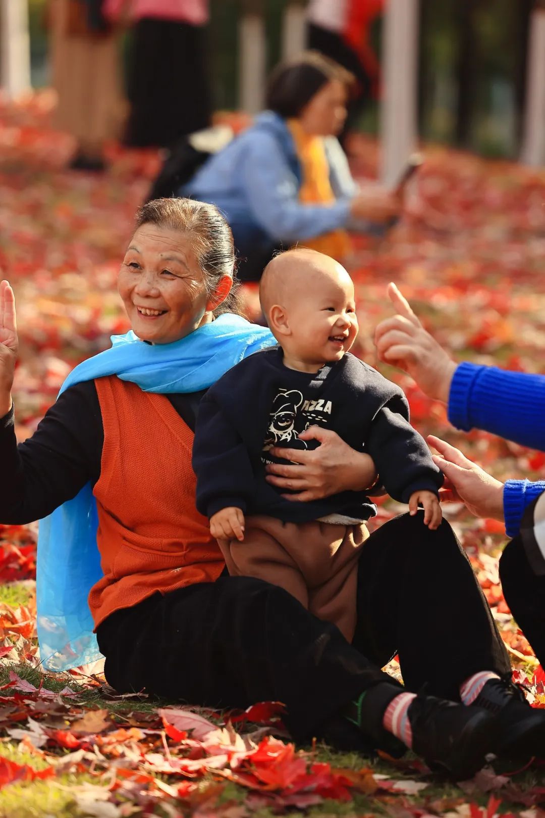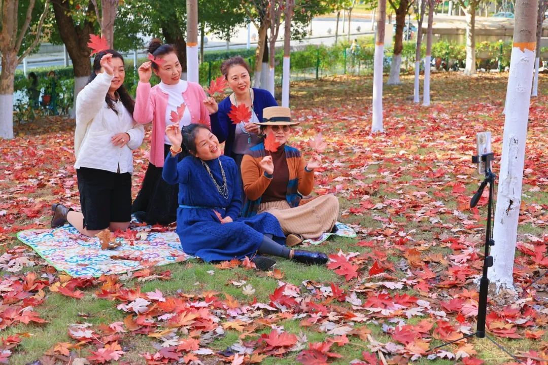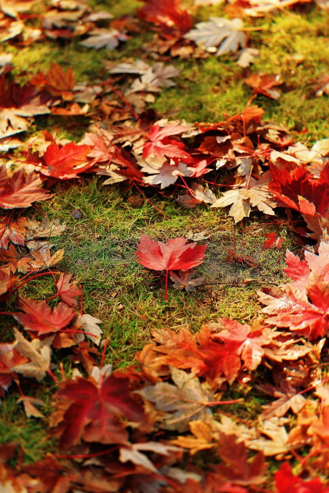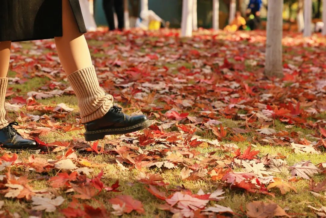 远方的黄绿植被与色彩斑澜的枫叶相映成趣。