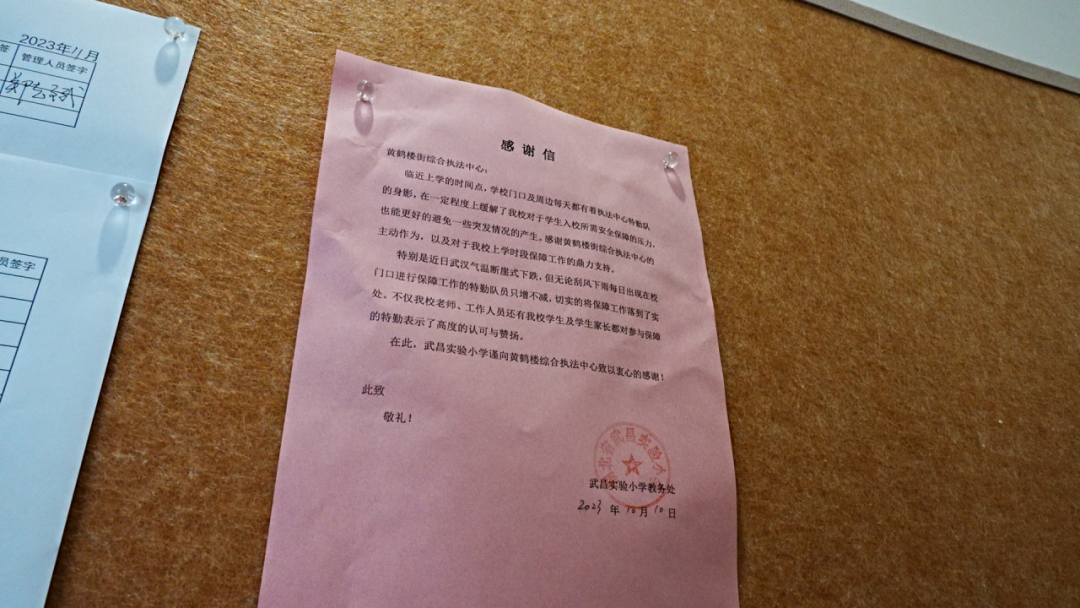 “真是太感谢你们啦,没想到跟你们一联系,街道、社区就把我们学校的燃眉之急解决了,真是省时省力又省心呀”。省实验小学张校长将一封感谢信交到了黄鹤楼街路长工作室的执法队员手中,并向执法队员当面表示了感谢。