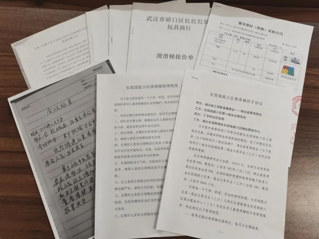 了解到居民这一诉求后,丁字桥社区以共驻共建为契机,积极与下沉单位湖北省工商联进行协商,希望借助其资源优势在小区内修建滑梯。通过多次联席会议,社区、业委会、下沉单位、居民代表共同商定修建及后续日常维护方案,并签署四方协议。由下沉单位湖北省工商联出资90%,业委会出资10%,筹集建设资金共4.2万余元;由业委会聘请专业第三方机构,全程跟进并督导施工建设;由业委会与小区物业服务中心制定管理使用制度,共同负责滑滑梯的日常管理及维护。
