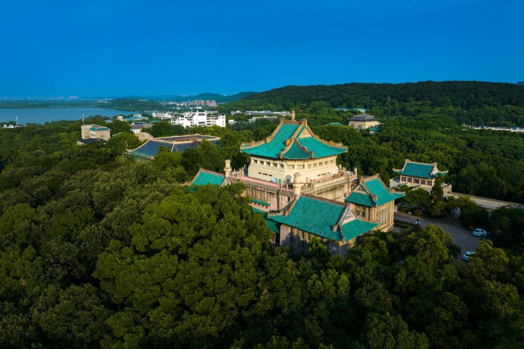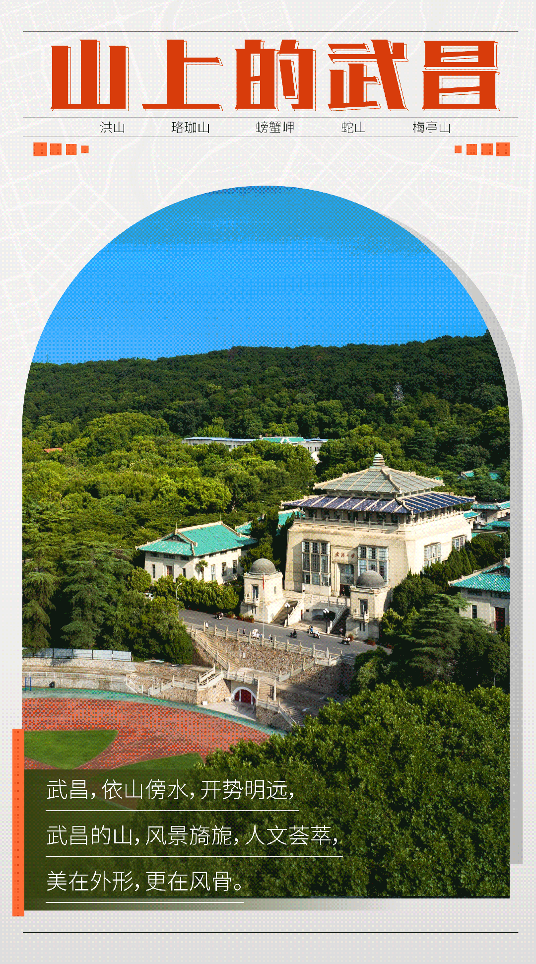 珞珈山山体呈东西走向,主峰高118.5米。珞珈山上,巨岩层现,奇石峭立,植物繁茂,建筑明丽,中国著名的高等学府武汉大学就坐落在珞珈山上。