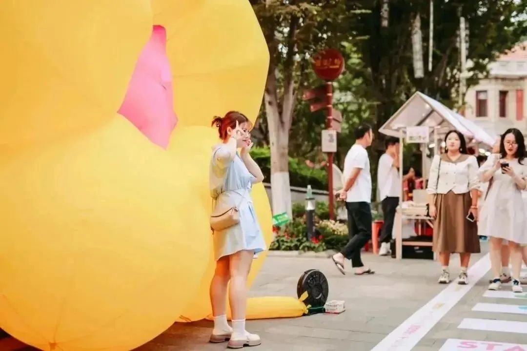 位于昙华林小镇和昙华广场的两朵4.5米高的“气模花花”,以及地上及周围视线所及的一众“小花花”,还有琳琅满目的展陈周边作品共同组成“送你花花”公共空间,“花花们造型简单,配色柔和,在人群和建筑中显得非常醒目,成为我们国庆期间新晋的网红打卡点。”昙华林公司相关负责人介绍。