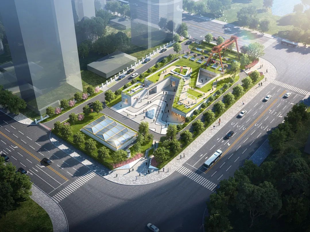 考虑到项目周边地势高差,设计方案采用地下式泵站的建设形式,利用场地竖向设计高差,通过建筑覆土和绿化覆盖,达到建筑整体的隐蔽与消解,形成公园型生态化泵站空间,延续城市垂江生态廊道。