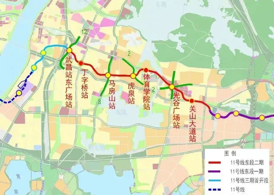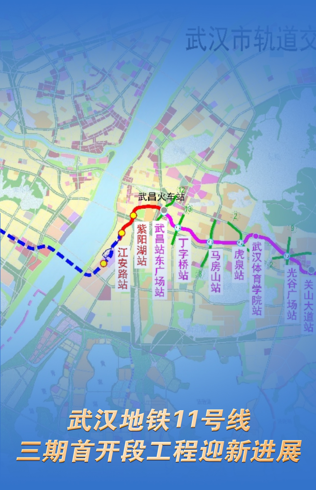 11号线三期首开段从武昌火车站至白沙洲,全长4公里,共设2站3区间。目前,2座车站主体结构已完工,3个区间正在盾构掘进。