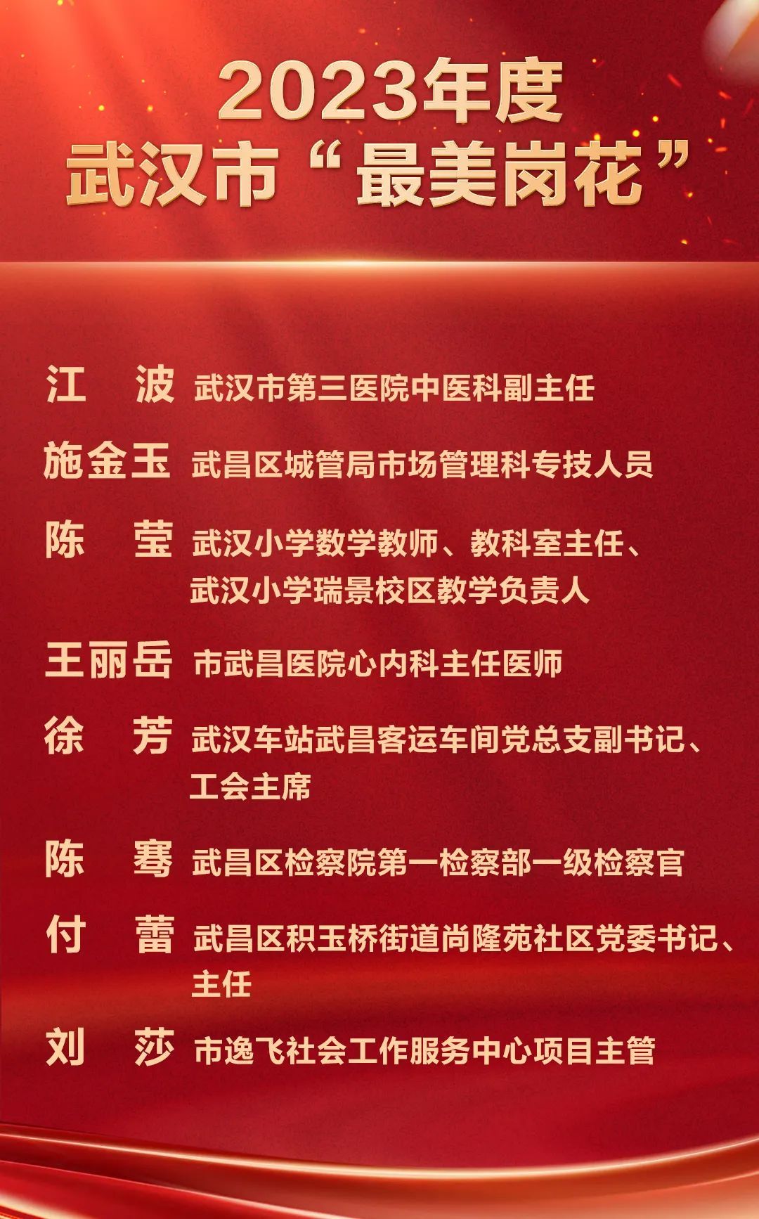 近期,武汉妇女“巾帼建功”活动领导小组办公室认定了2023年武汉市“巾帼文明岗”及“最美岗花”并公布名单。武昌区10个岗位被认定为市级“巾帼文明岗”,8名个人被认定为“最美岗花”。