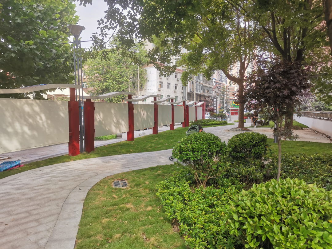 在各方的共同努力下,徐东共同缔造口袋公园于2023年6月2日建成。该方案在保留原有文化宣传栏的基础上,对窨井进行改造,消除恶臭气味的发散。对树木进行维护修剪,对地面进行平整种植草坪绿植,铺设小路,使地面更加整洁美观,方便行走。修建蜿蜒曲折的园路分隔景观空间,沿路设多条条形座椅,围绕三株香樟设置休闲区域,加装运动健身器材,同时增设节能照明装置,完善便民服务功能,打造小而精的口袋公园。