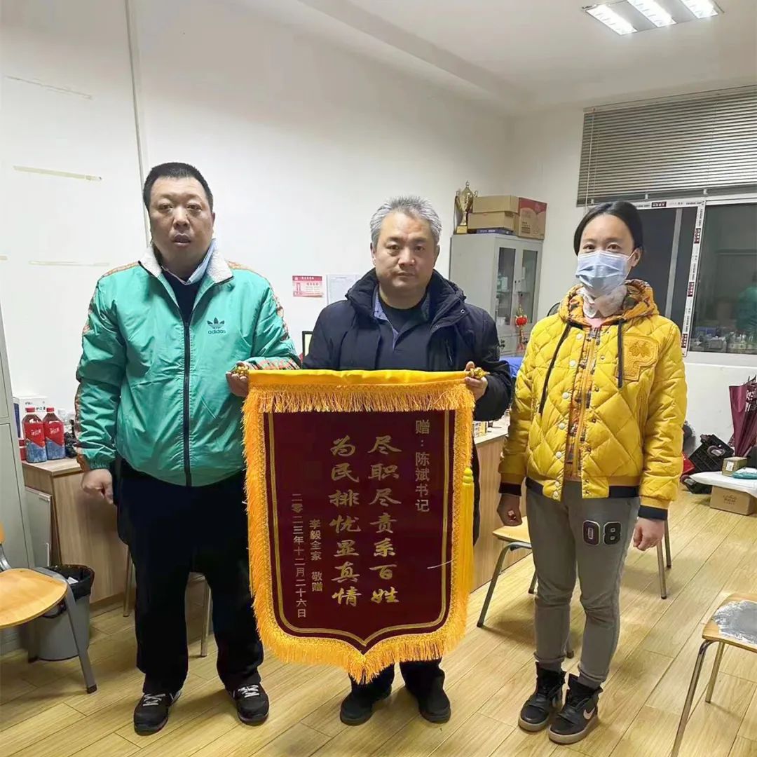 10月14日,邻里长颜丽琴走访杜婆婆时得知,她患精神疾病的儿子因生活困难未及时购买药物,导致精神疾病发作被强制送医,现杜婆婆瘫痪在床、无人照顾。邻里长把这一紧急情况报给社区,社区网格员第一时间上门了解详细情况,辖区内热心居民、邻里长王姐主动承担照顾杜婆婆、负责其生活起居的任务。社区将杜婆婆家中情况上报街道,为其申请生活补助、办理低保。因天气逐渐寒冷,社区陈书记担心杜婆婆的儿子在医院没有保暖的衣服,便和社区同事为其送去过冬棉衣。12月,杜婆婆的儿子经过积极治疗出院回家,得知社区“雪中送炭”后,送了一面锦旗表达感谢。