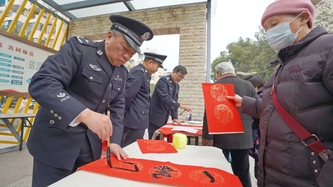 “方警官,帮我写一副春联”,一位爹爹在旁边高声说道。省级书法家协会会员、武昌分局民警方金玉同志携分局警营书法家们在现场挥毫泼墨,为市民群众“送祝福送平安”,让群众“零距离”感受武昌公安的警营文化。
