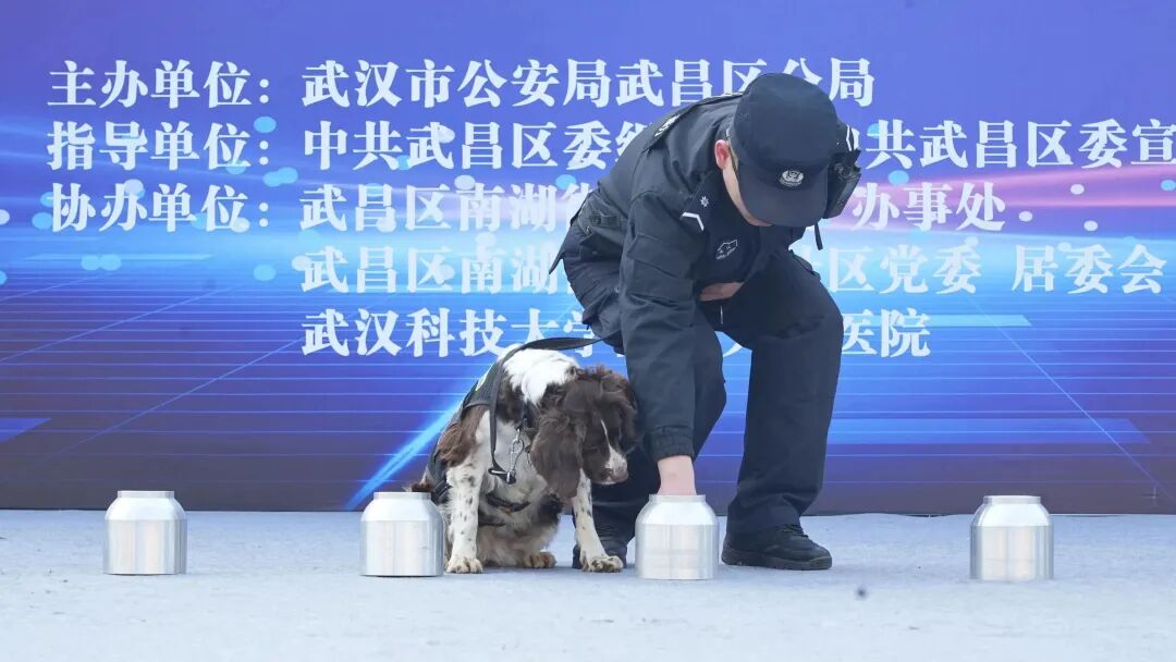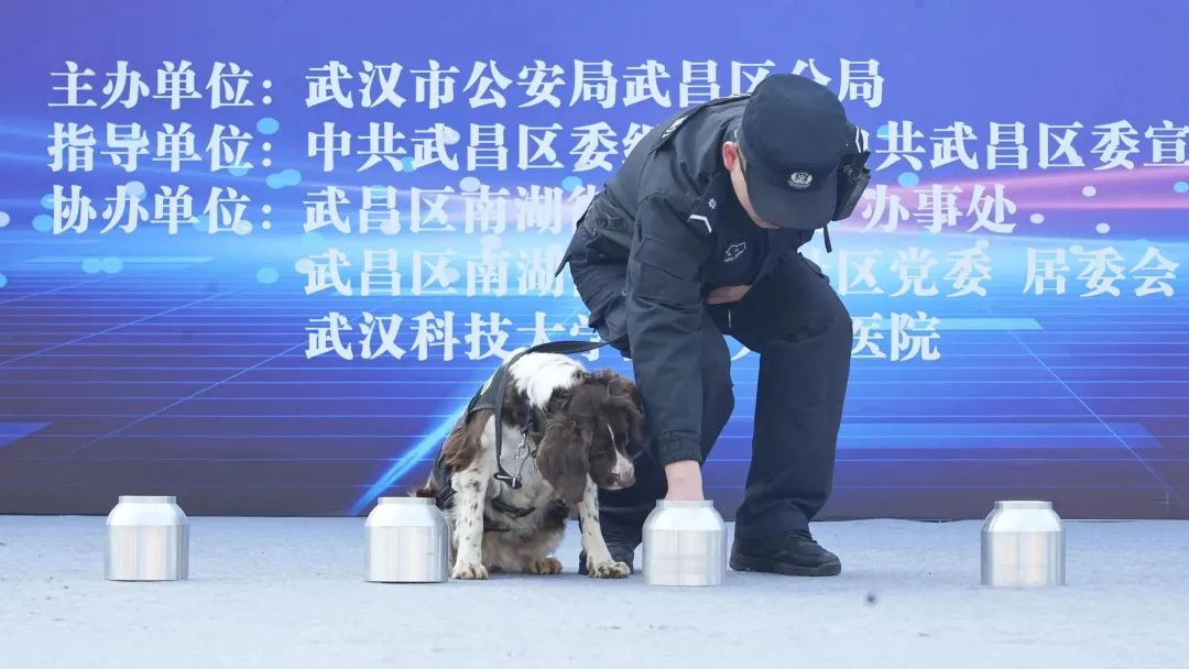 “汪汪汪”的声音一下让现场安静下来,一只身穿“武昌缉毒”的帅气警犬一下夺走了所有人目光,随着训导员一声令下,警犬“俊灵”一步跳下舞台,执行训导员交给“它”的任务。