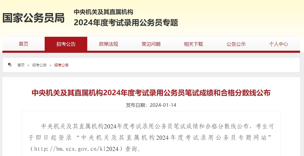 中央机关及其直属机构2024年度考试录用公务员笔试成绩和合格分数线公布