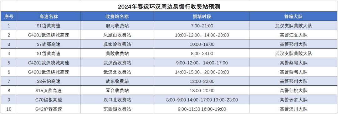 武汉绕城武汉西、东西湖、横店,福银黄梅,汉蔡红庙、侏儒,岱黄黄陂,武鄂华容南,硚孝灯塔,关豹豹澥等10个互通路段车流相对集中,拥堵风险高。
