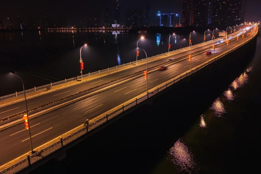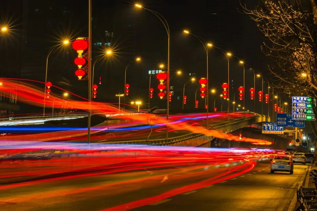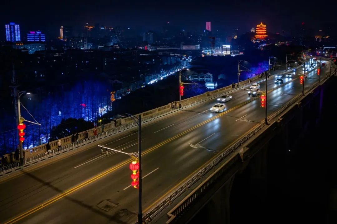沙湖大桥上路灯与星辰交相辉映,大桥两侧的灯笼映衬着春节气氛愈发浓厚。