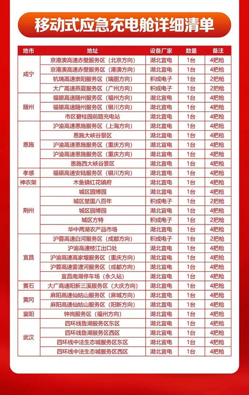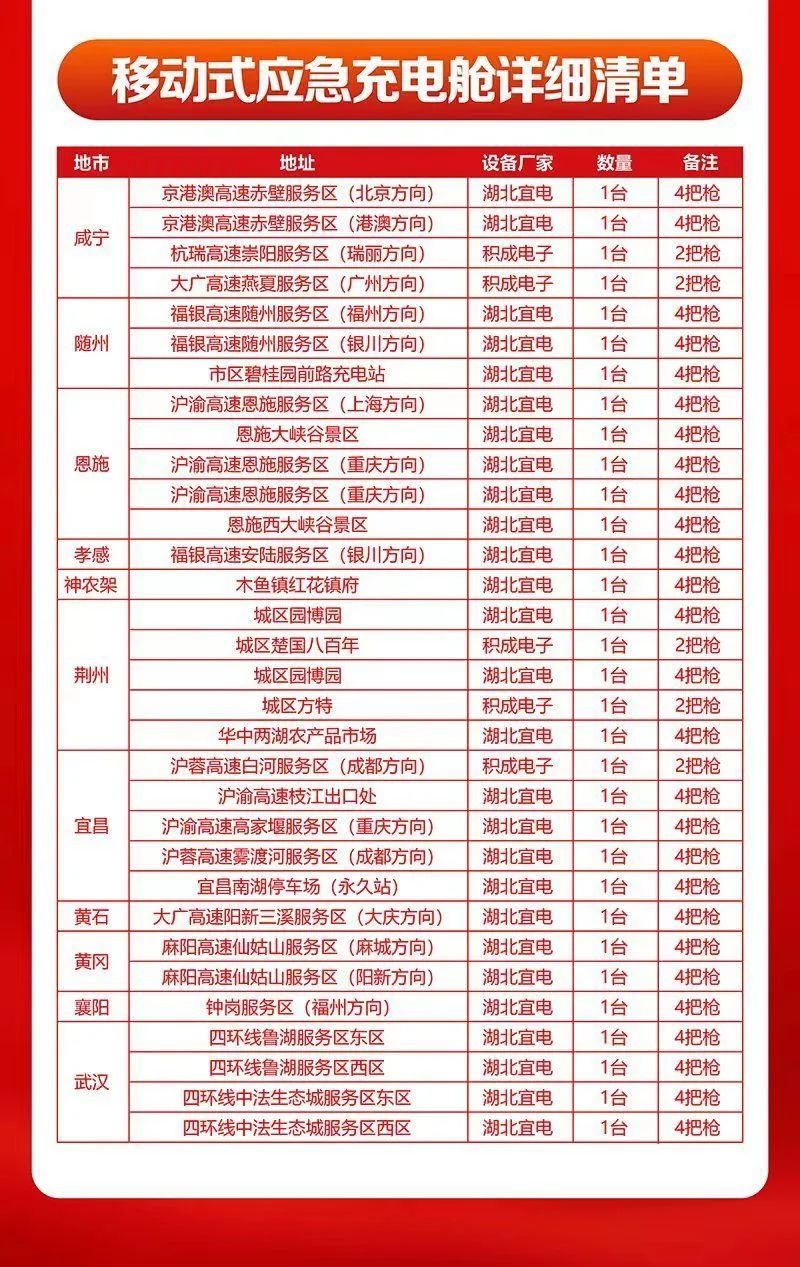 在高速公路上,今年春节假期,国网湖北电力在孝感安陆、宜昌白河等部分服务区投入了32台移动应急充电舱,当服务区充电泊位不足时,移动应急充电舱可为车主提供应急充电服务,避免车主长时间等位。