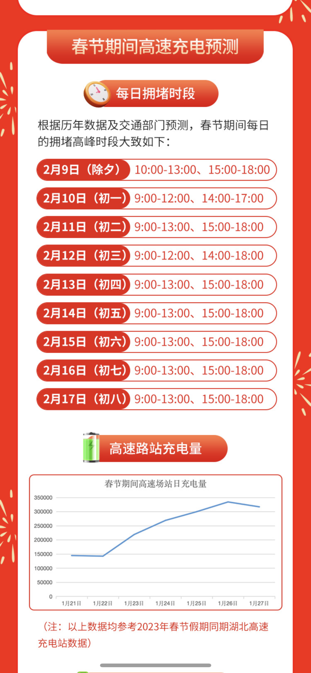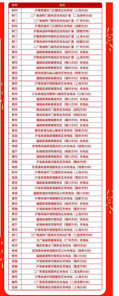 目前,在湖北全省高速上共有253个充电站,959个充电桩,不同站点的拥堵程度也不一样,国网湖北电动汽车服务有限公司还预测了今年春节假期,易拥堵的54个站点,包括沪蓉高速天门北服务区充电站 (上海方向)、福银高速薪春服务区 (银川方向) 充电站、京港澳高速孝感服务区公共充电站 (港澳方向)等,主要分布在荆州、荆门、黄冈、孝感等地。