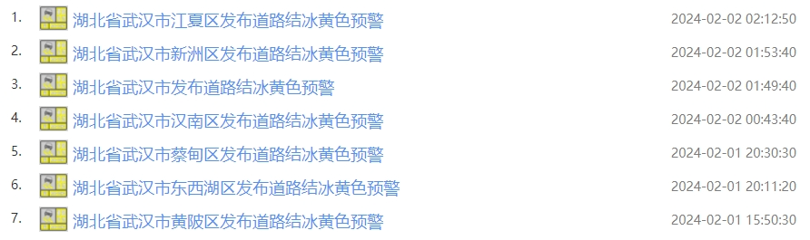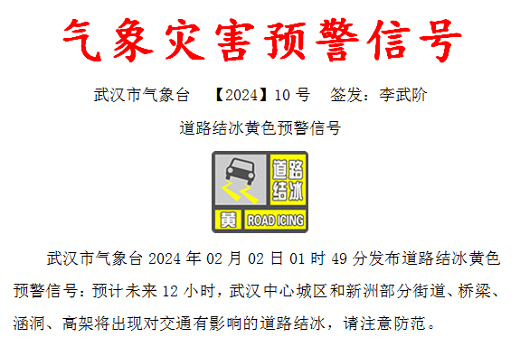 武汉市气象台和多个区气象台接连发布道路结冰黄色预警