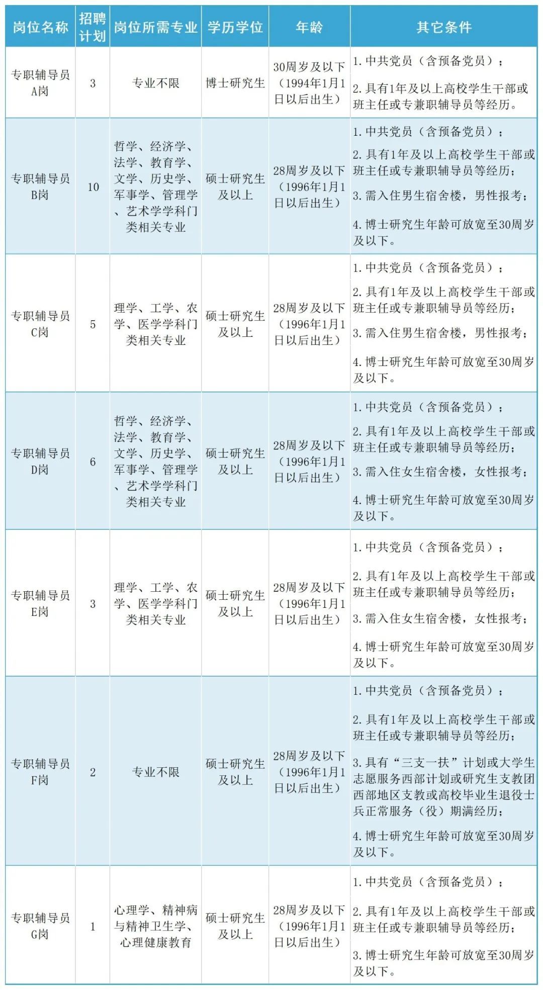 根据学校事业发展需要,现面向社会公开招聘专职辅导员30人,具体岗位及条件详见下表。