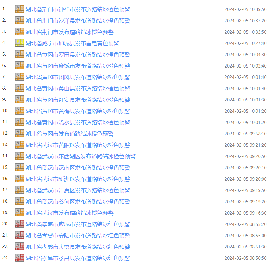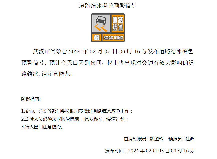 武汉市气象台发布道路结冰橙色预警预计今天白天到夜间