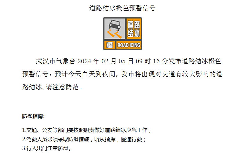 武汉市气象台2月5日09时发布道路结冰橙色预警: