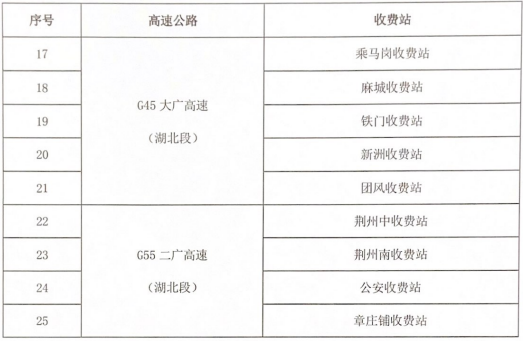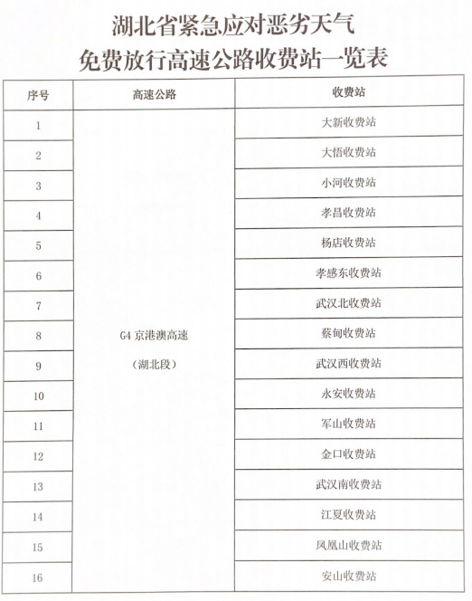 针对近日湖北省境内G4京港澳、G45大广和G55二广高速公路等部分路段因恶劣天气造成车辆拥堵严重的情况,根据交通运输部调度会精神,经省人民政府同意,自2024 年2月5日15: 00至20: 00,对在指定收费站 (详见附表)驶出高速公路的所有车辆实施免费放行。