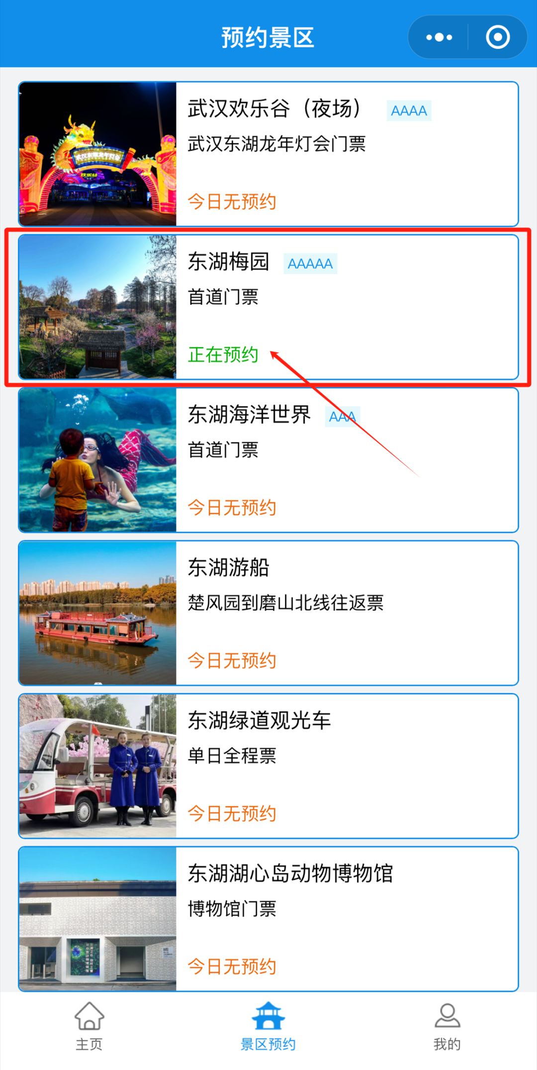 关注「武汉东湖」官方微信公众号(账号:easylake),进入公众号主页,点击下方菜单栏【惠游东湖】进行预约。