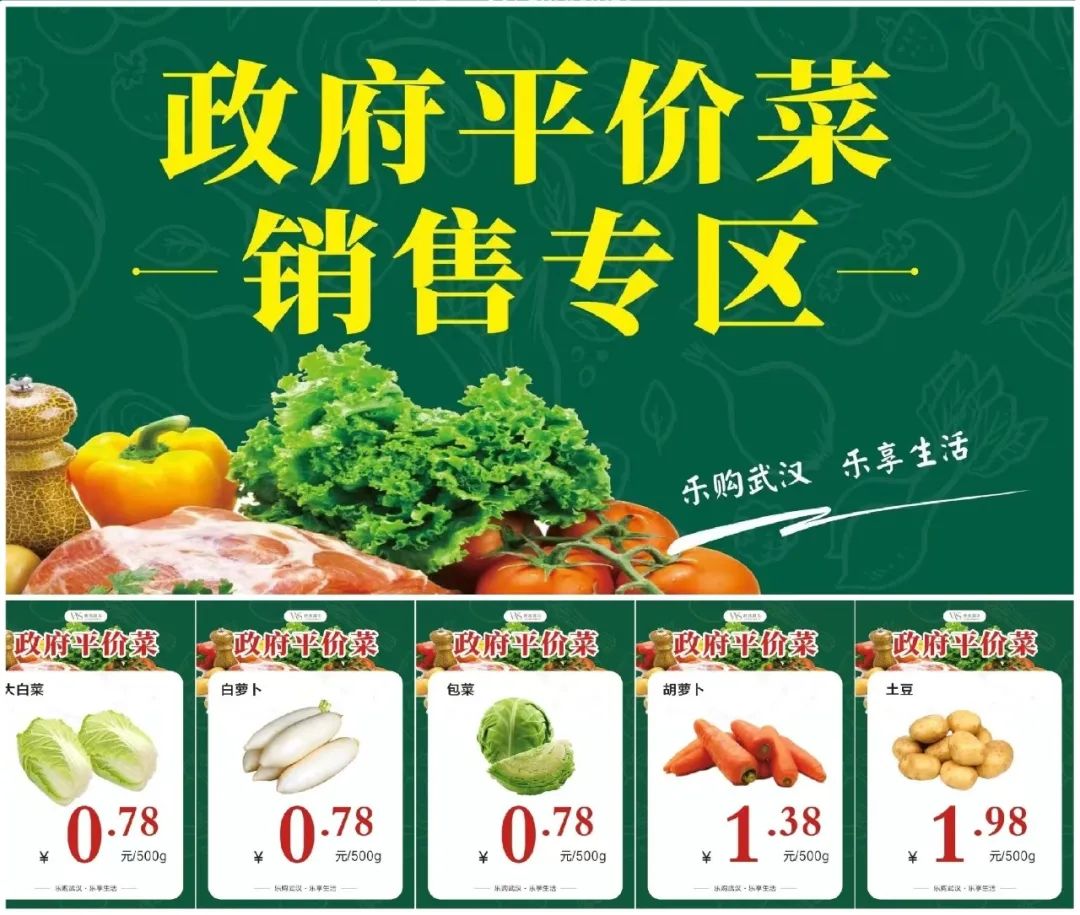 为积极应对近期冰冻雨雪天气影响,确保全市春节期间蔬菜市场价格平稳,保障市民生活基本生活需求,2月8日至2月12日(腊月二十九至大年初三)期间,按照武汉市政府部署,武商、中百、中商三大商超将在130余家门店设置政府平价菜销售专区,销售大白菜、包菜(圆白菜)、白萝卜、胡萝卜、土豆5种蔬菜。