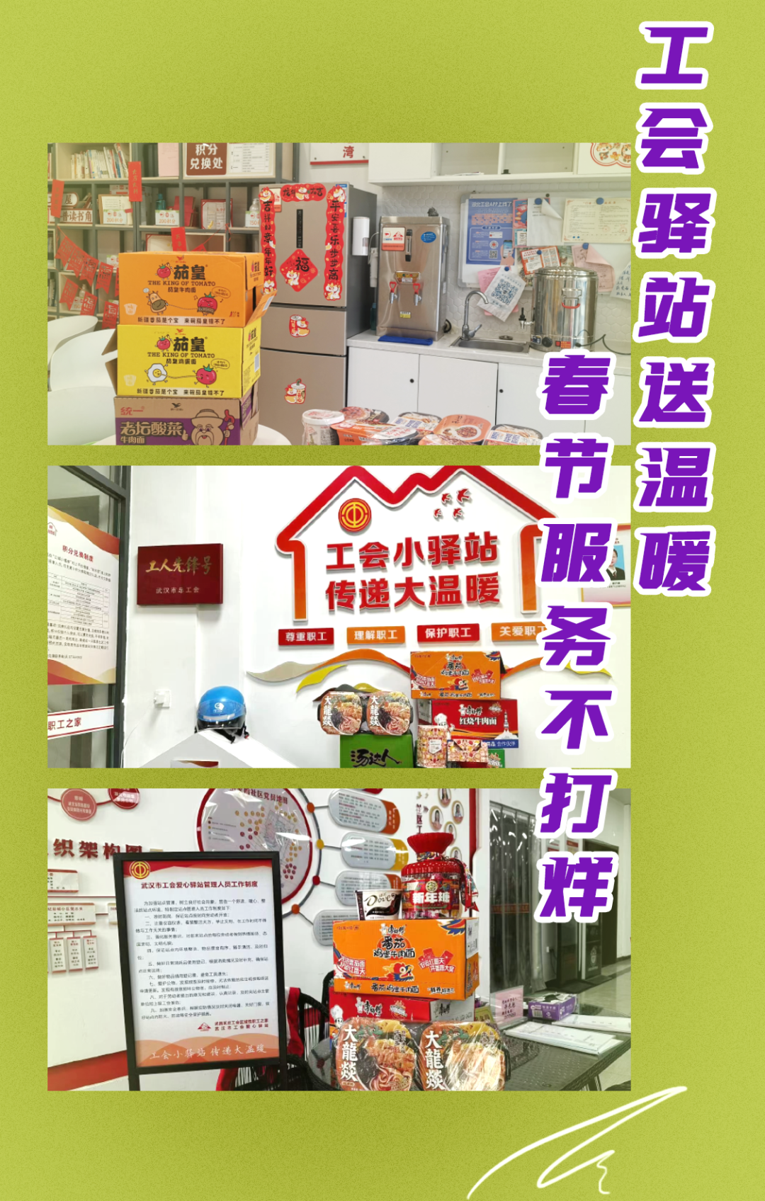 武昌区总工会积极落实服务春节期间坚守岗位一线职工“十项举措”,做到工会服务“不打烊”。“征集令”一出,武昌区31家工会驿站积极响应,迅速“集结”,共同推出“工会驿站送温暖,春节服务不打烊”活动,为职工群众,特别是坚守岗位的一线职工提供贴心生活服务和实实在在优惠便利。