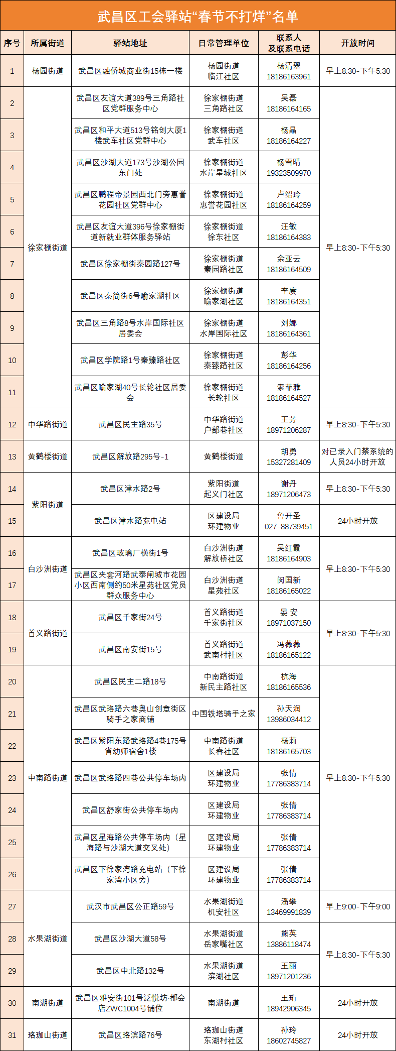武昌区“春节不打烊”驿站共31家,详细信息请查看下表。