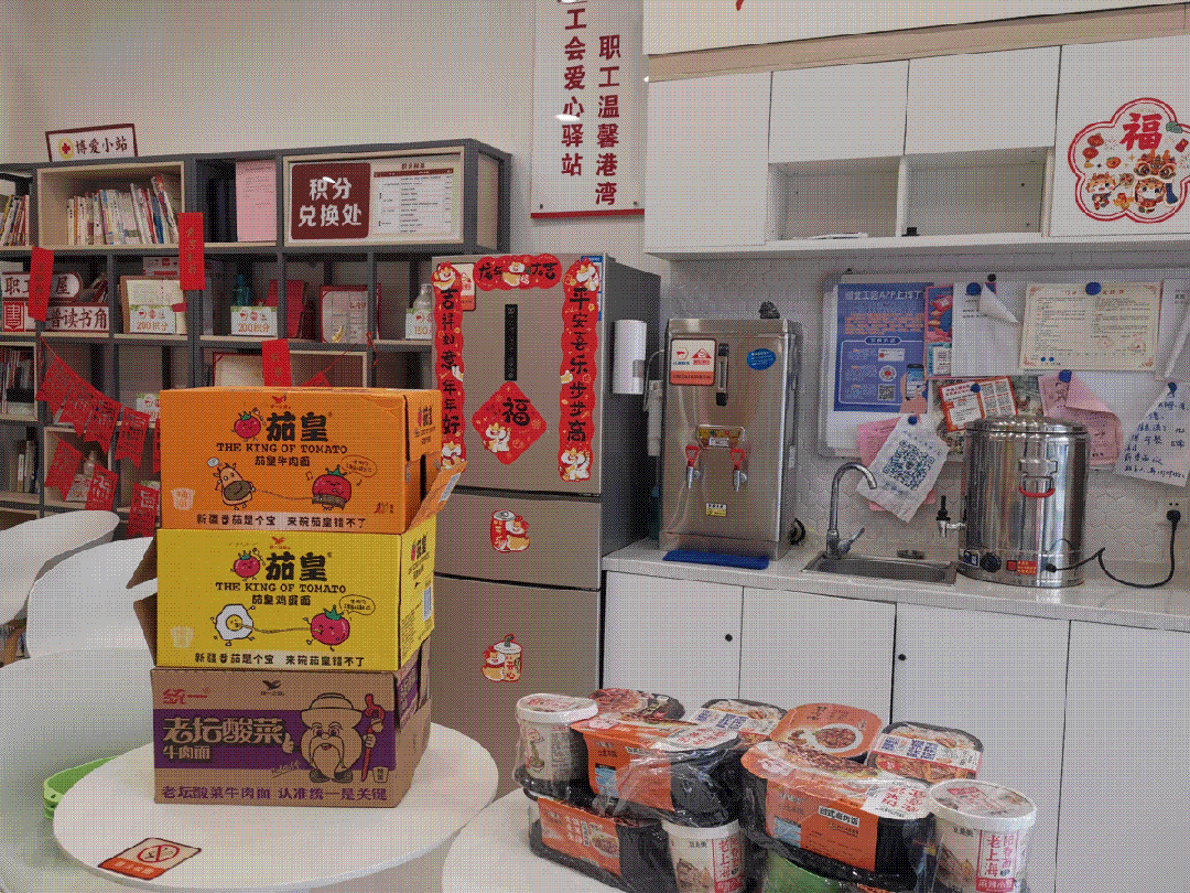 工会驿站不仅免费提供热水、热饭、补给、充电等服务,还在春节期间推出春节专享福利套餐,有牛奶、面包、自热饭、零食、暖宝宝等,专门解决春节期间为保障城市运行、默默坚守在工作岗位上的劳动者们吃饭难等问题。
