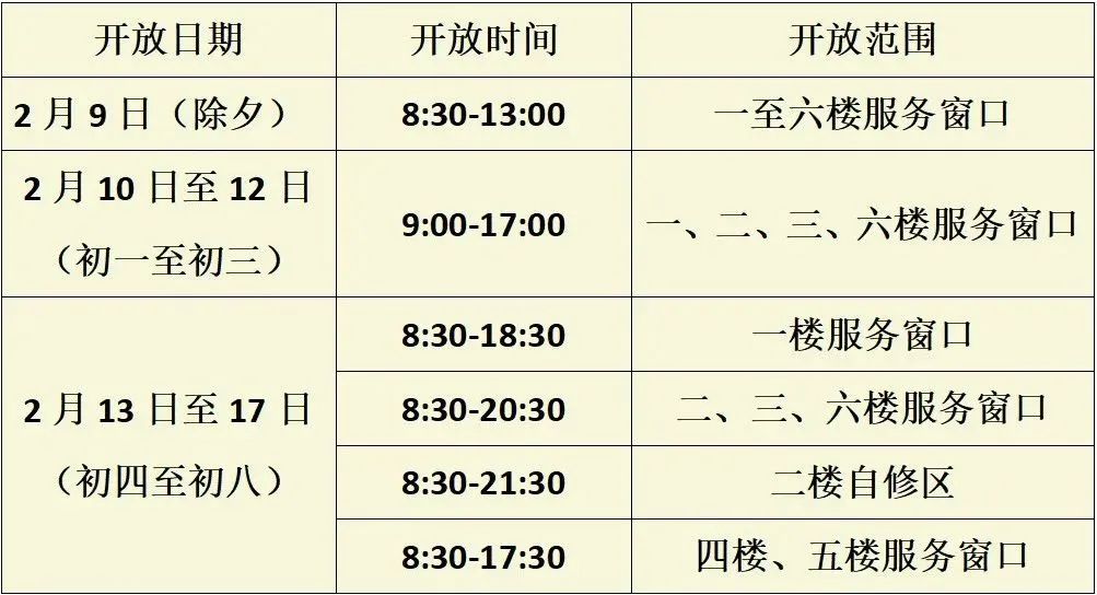 2月13日起:恢复正常营业时间,周一至周五:9:00-20:30;周六周日:9:00-21:00