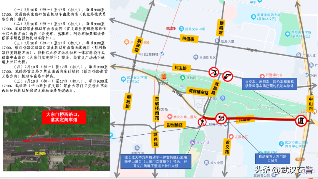(三)2月10日(初一)至17日(初八),每日9:00至17:00,彭刘杨路武珞路口禁止机动车由南向北通行(彭刘杨路往黄鹤楼方向),往长江大桥方向机动车一律右转绕行武珞路中山路口(大东门立交桥下)掉头,经首义广场地下通道上长江大桥。