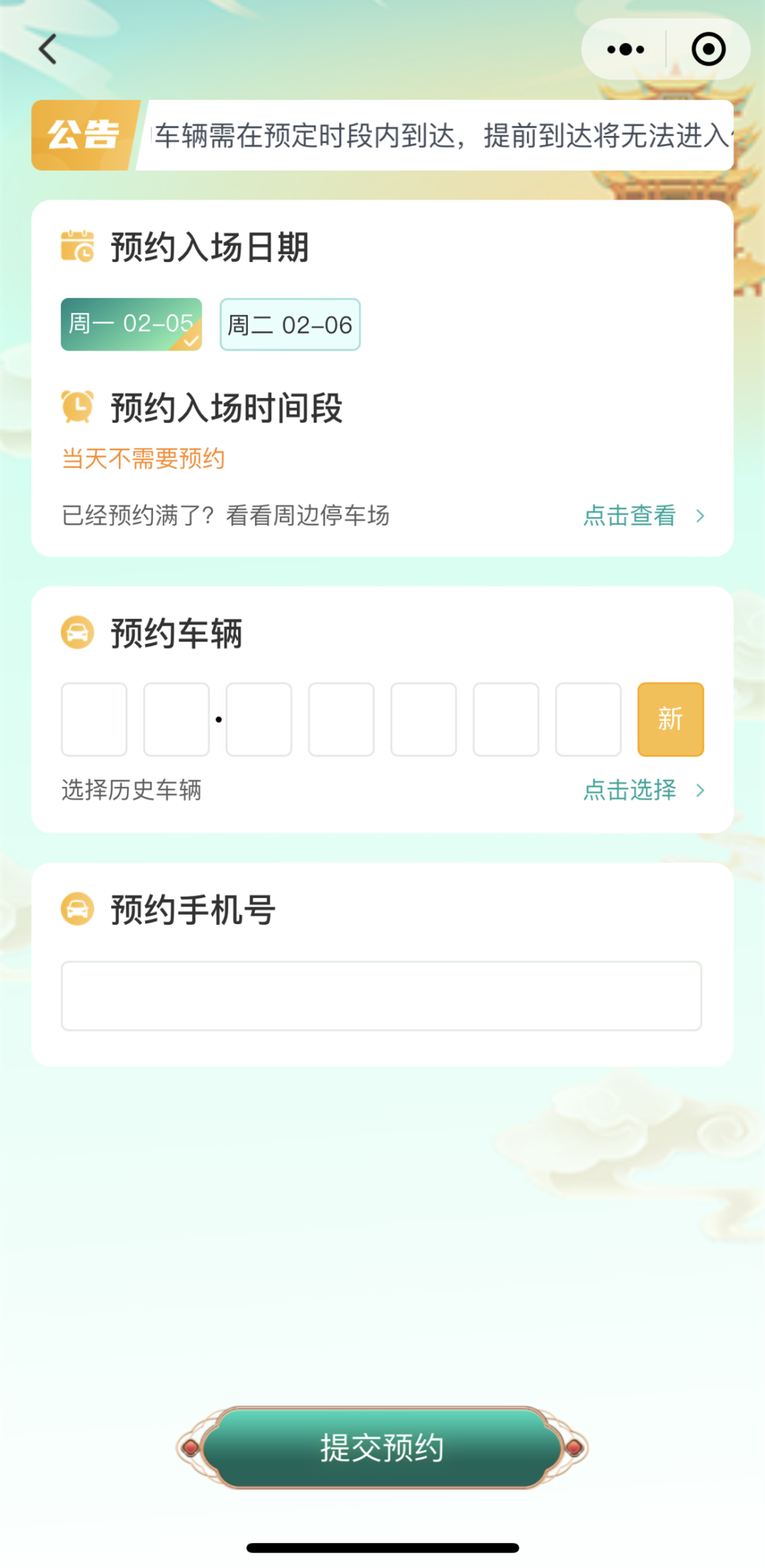 点击“开始预约”,阅读预约须知,在预约页面,选择您想要预约的日期和时间段。每天有十三个时间段,分为7:00-8:00、8:00-9:00、9:00-10:00、10:00-11:00、11:00-12:00、12:00-13:00、13:00-14:00、14:00-15:00、15:00-16:00、16:00-17:00、17:00-18:00、18:00-19:00、19:00-22:00。车辆必须在预约时段内到达,提前或延后都可能无法入场。已进入停车场时间开始计算停车时长,建议最大停车时长为4小时,停放3小时将发送提示短信,提示剩余1小时停车时长,请提前做好行程安排。