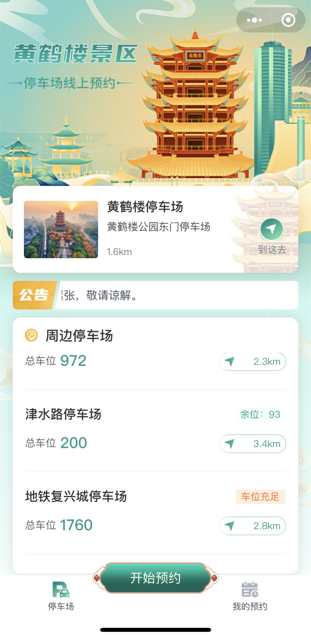 黄鹤楼景区停车位有限,为确保您有一个愉快的旅程,建议您提前预约停车位。