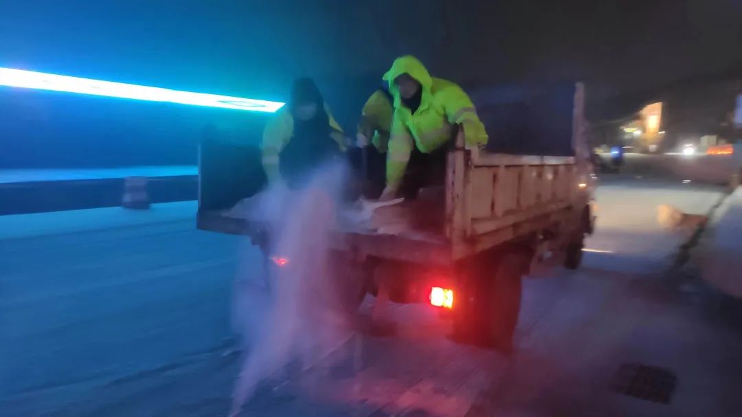 石洞街道办事处为辖区主干道撒盐防止路面结冰,街道、社区和环卫全体工作人员参与扫雪。