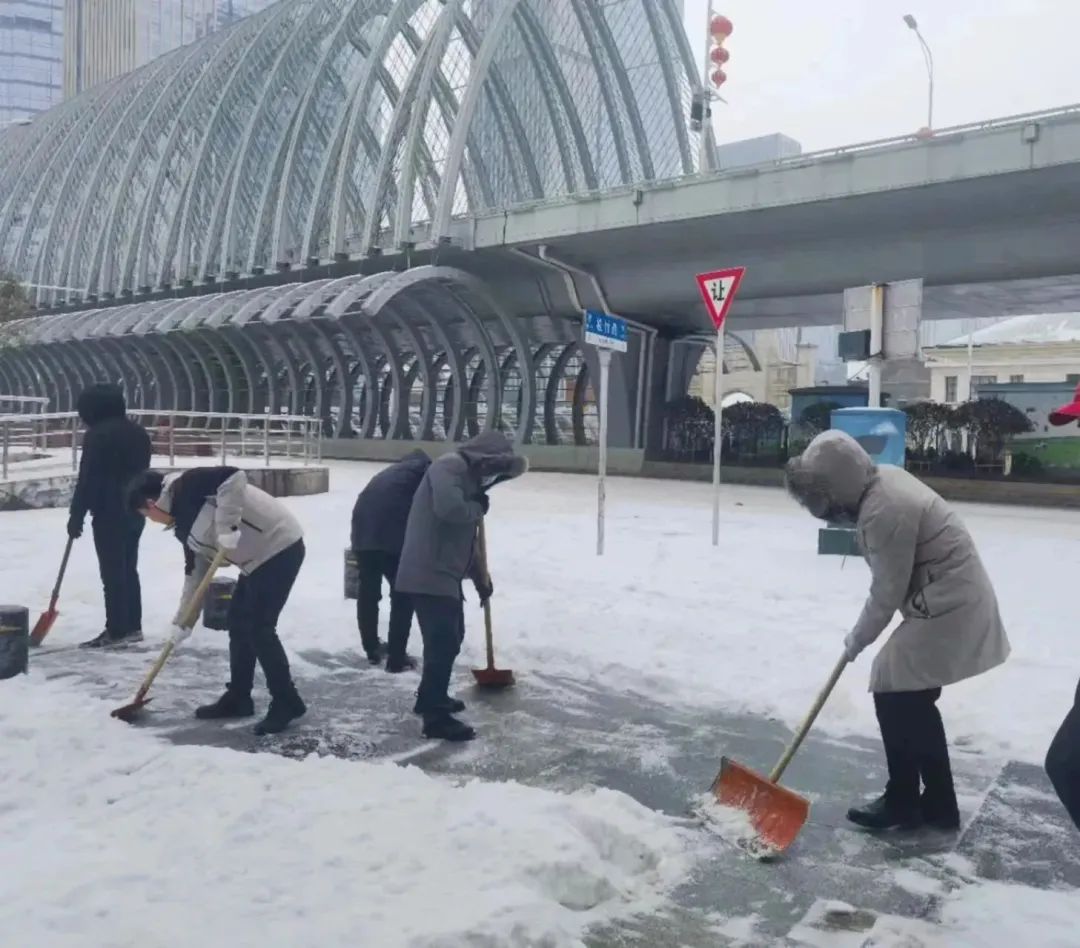 徐家棚街道武车社区、绿地楚峰物业,对三角路地铁E出口周边道路扫雪除冰。