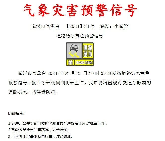 武汉市气象台昨日20时35分发布道路结冰黄色预警信预计今天上午我市仍将出现对交通有影响的道路结冰请注意防范