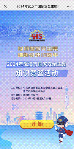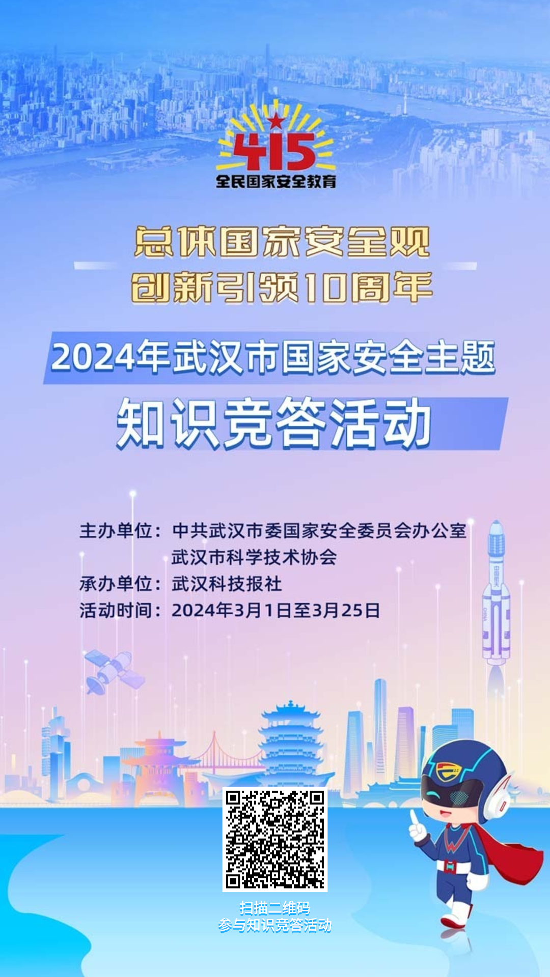 今年是习近平总书记创造性提出总体国家安全观10周年,4月15日是第九个全民国家安全教育日。为全面宣传贯彻总体国家安全观,不断增强全民国家安全意识和素养,营造浓厚的国家安全宣传学习氛围,由中共武汉市委国家安全委员会办公室、武汉市科学技术协会主办,武汉科技报社承办的2024年武汉市国家安全主题知识竞答活动于3月1日正式启动。